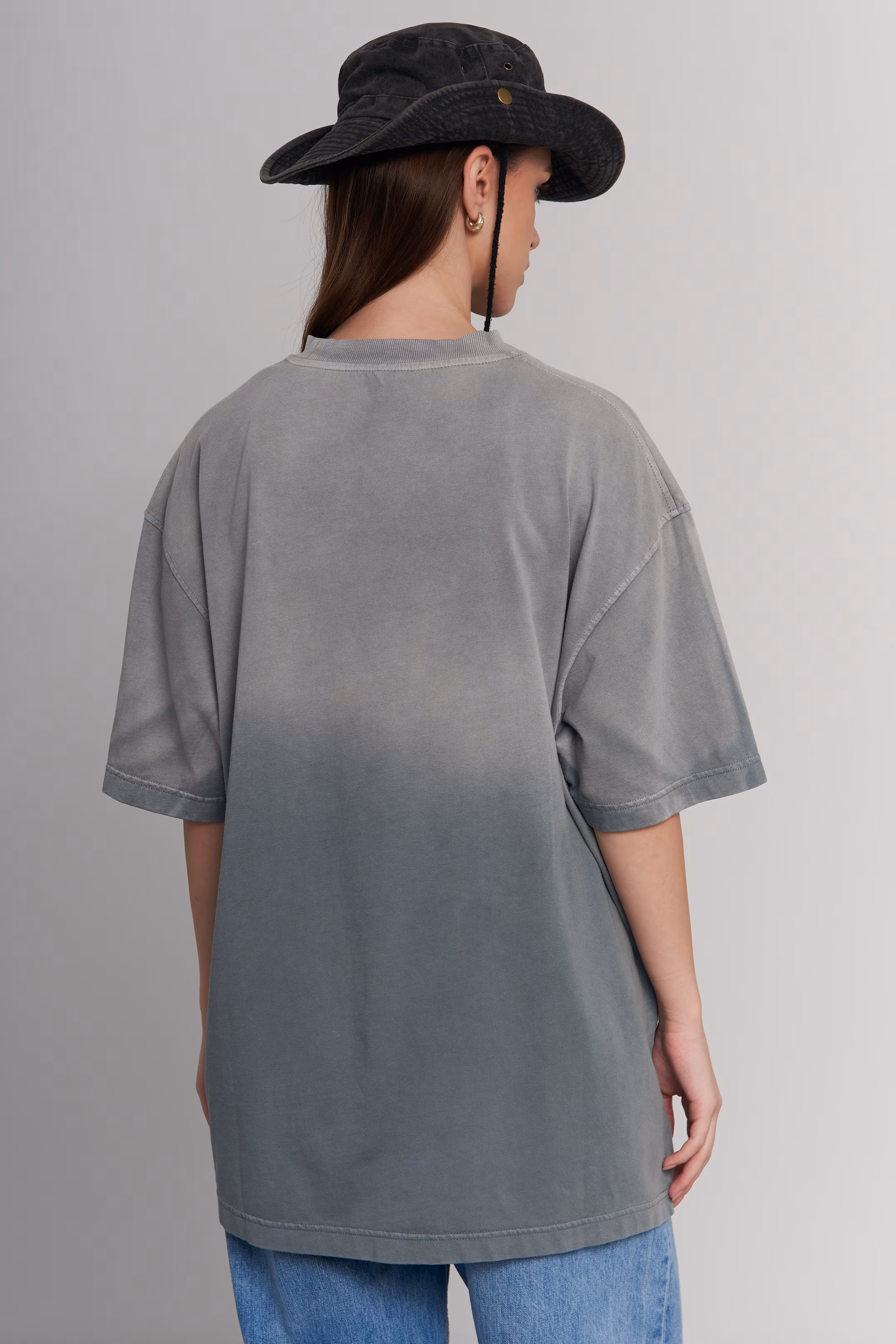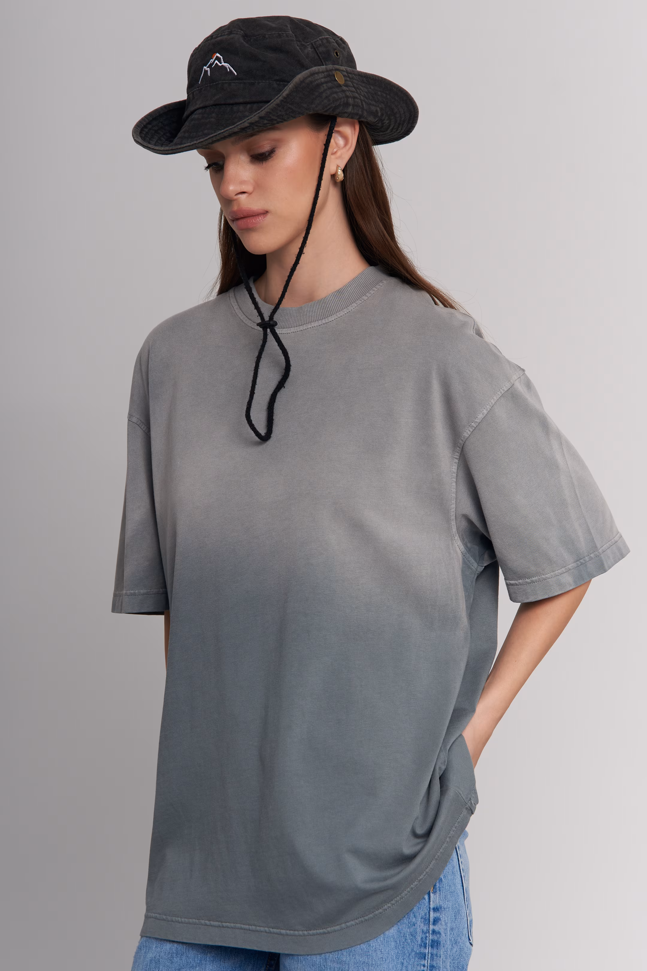 Oversized T-shirt with a top-to-bottom gradient — light grey at the top fading to dark charcoal at the bottom. No print. Crew neck. Dropped shoulder. 100% cotton. Model measurements: Height 174 cm Chest 88 cm Waist 60 cm Hips 94 cm