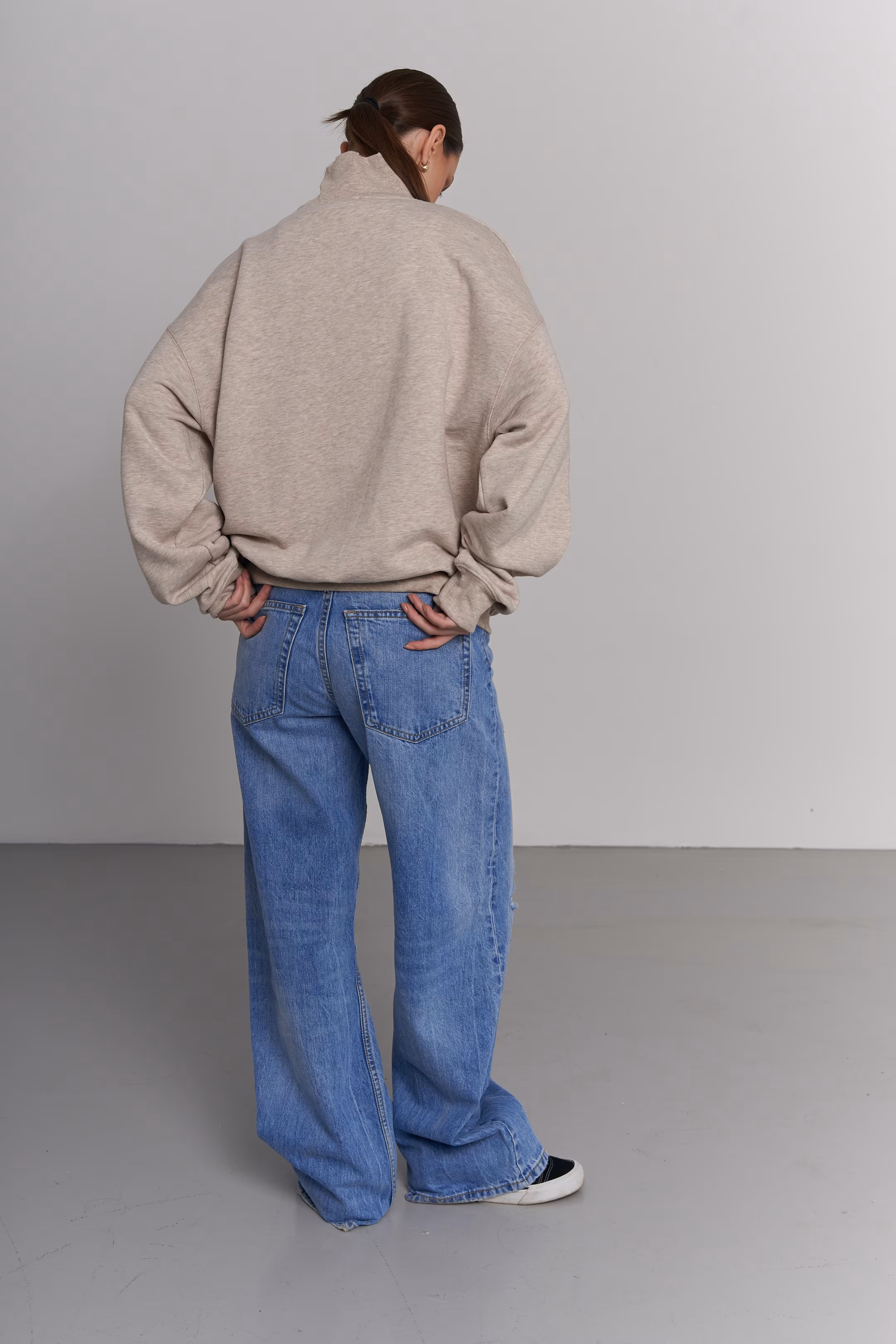 Oversized sweatshirt in dark gray. Quarter-zip stand collar. No print. Ribbed cuffs and hem. 100% cotton. Model measurements: Height 174 cm Chest 88 cm Waist 60 cm Hips 94 cm