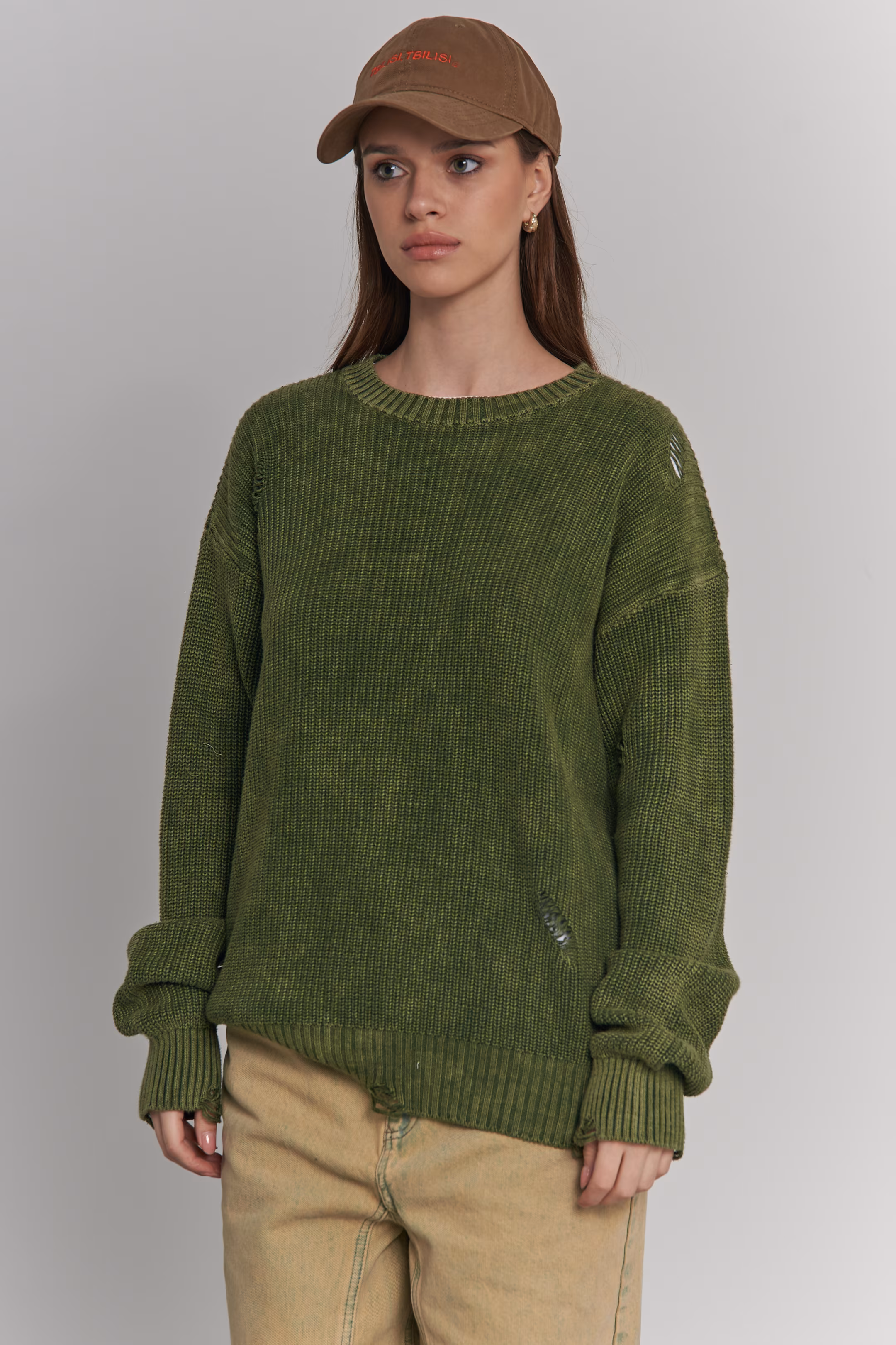 Ribbed knit crewneck sweater in army green. Distressed holes at shoulder and cuffs. Oversized fit. Ribbed cuffs and hem. Model measurements: Height 174 cm Chest 88 cm Waist 60 cm Hips 94 cm