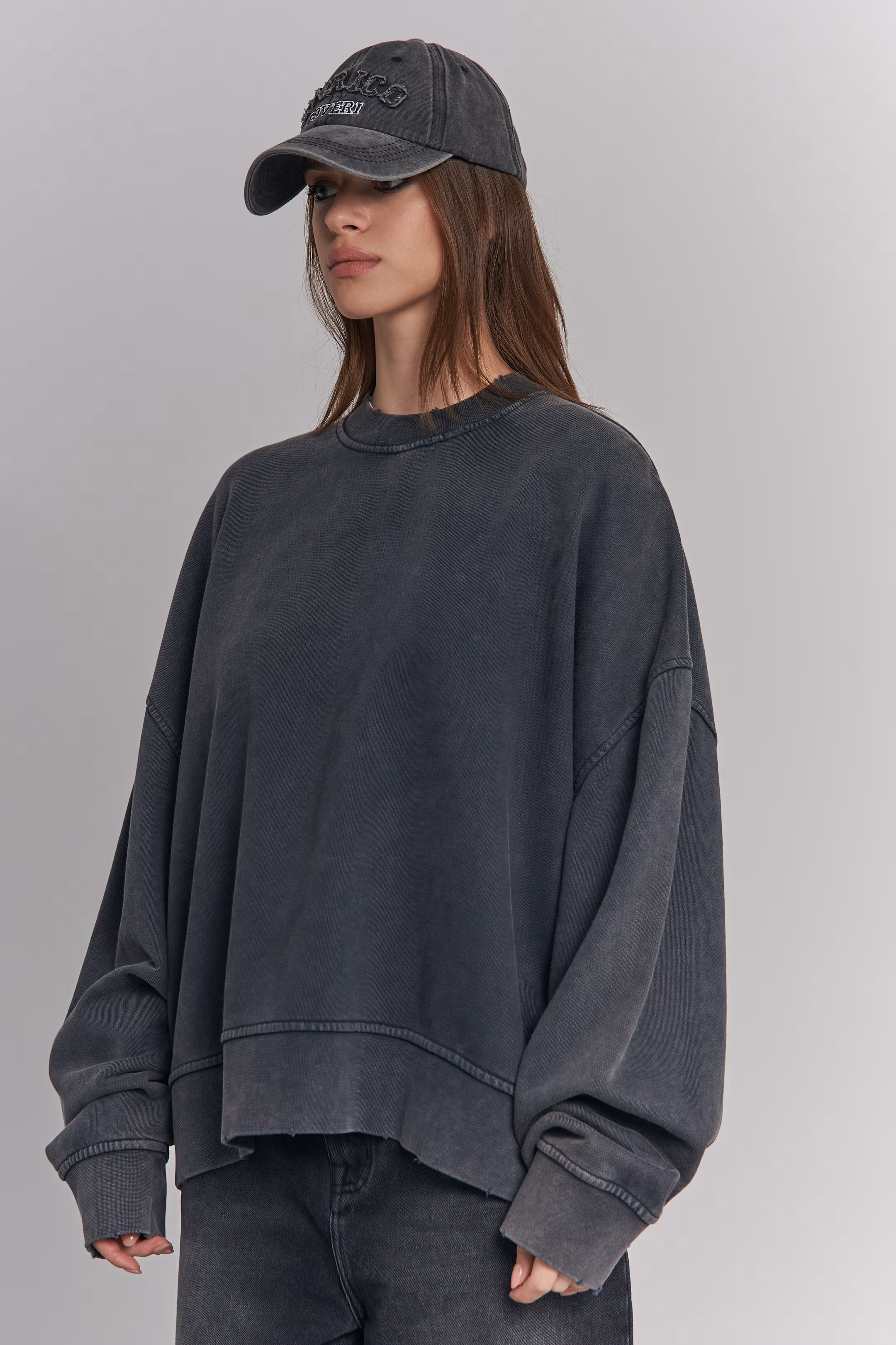 Oversized cropped crewneck sweatshirt in charcoal. Stone-wash effect throughout the fabric. No hood. Wide ribbed hem band. Ribbed cuffs. 100% cotton. Model measurements: Height 174 cm Chest 88 cm Waist 60 cm Hips 94 cm