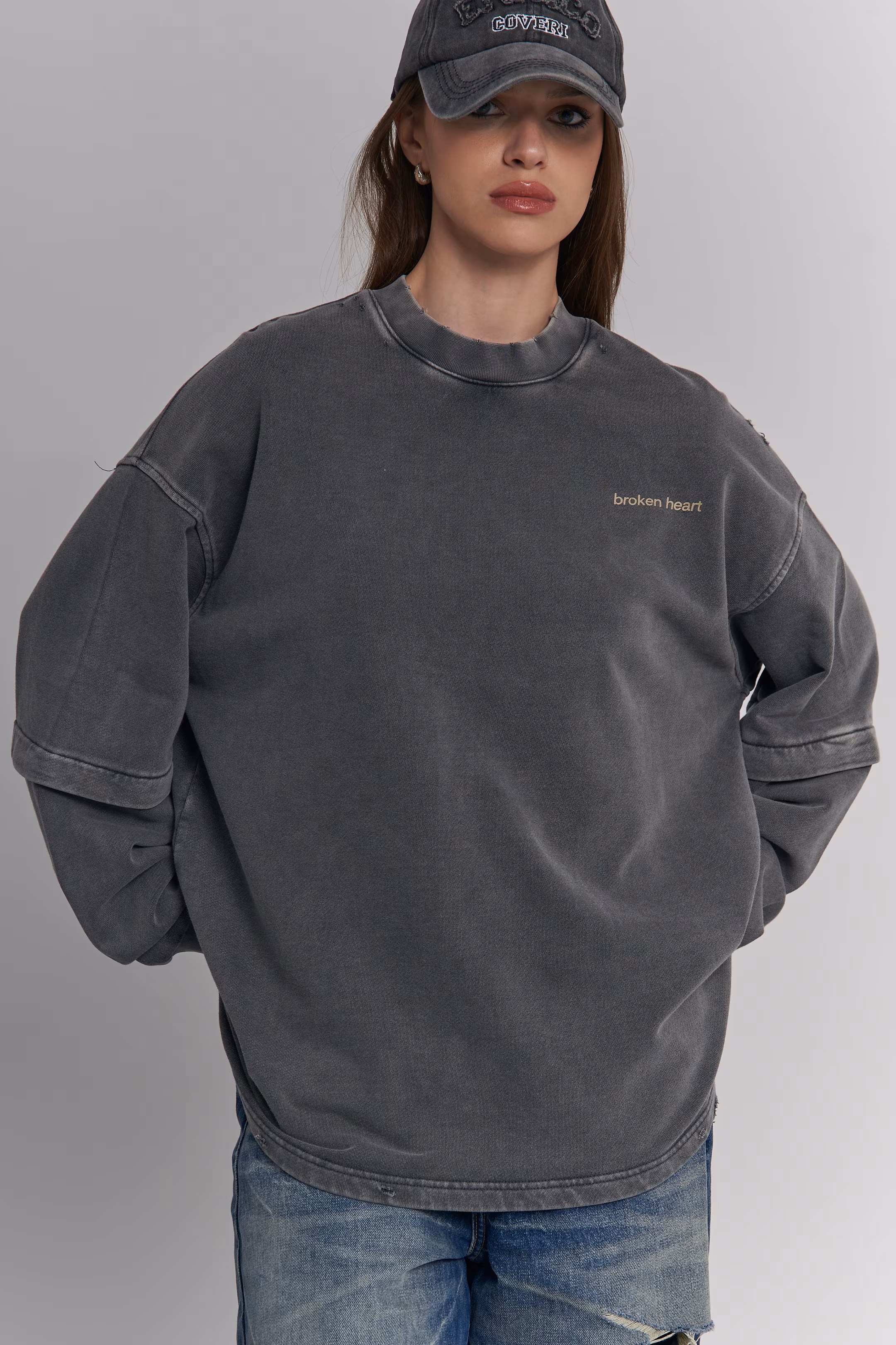 Oversized crewneck sweatshirt in charcoal. Small "broken heart" text embroidery on the chest. Double-layered sleeve with extra ribbed cuff at mid-sleeve. Stone-wash effect. Ribbed cuffs and hem. 100% cotton.