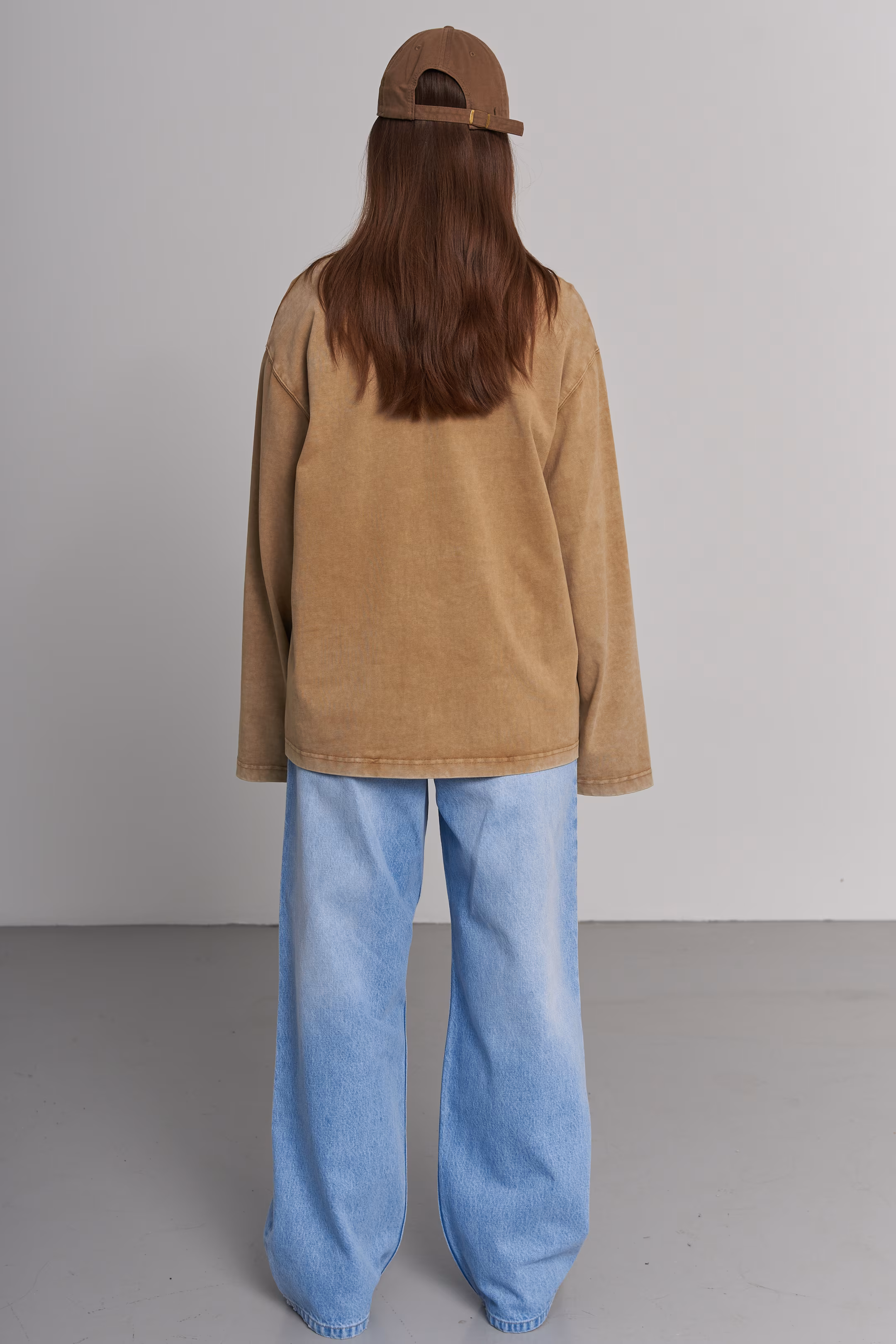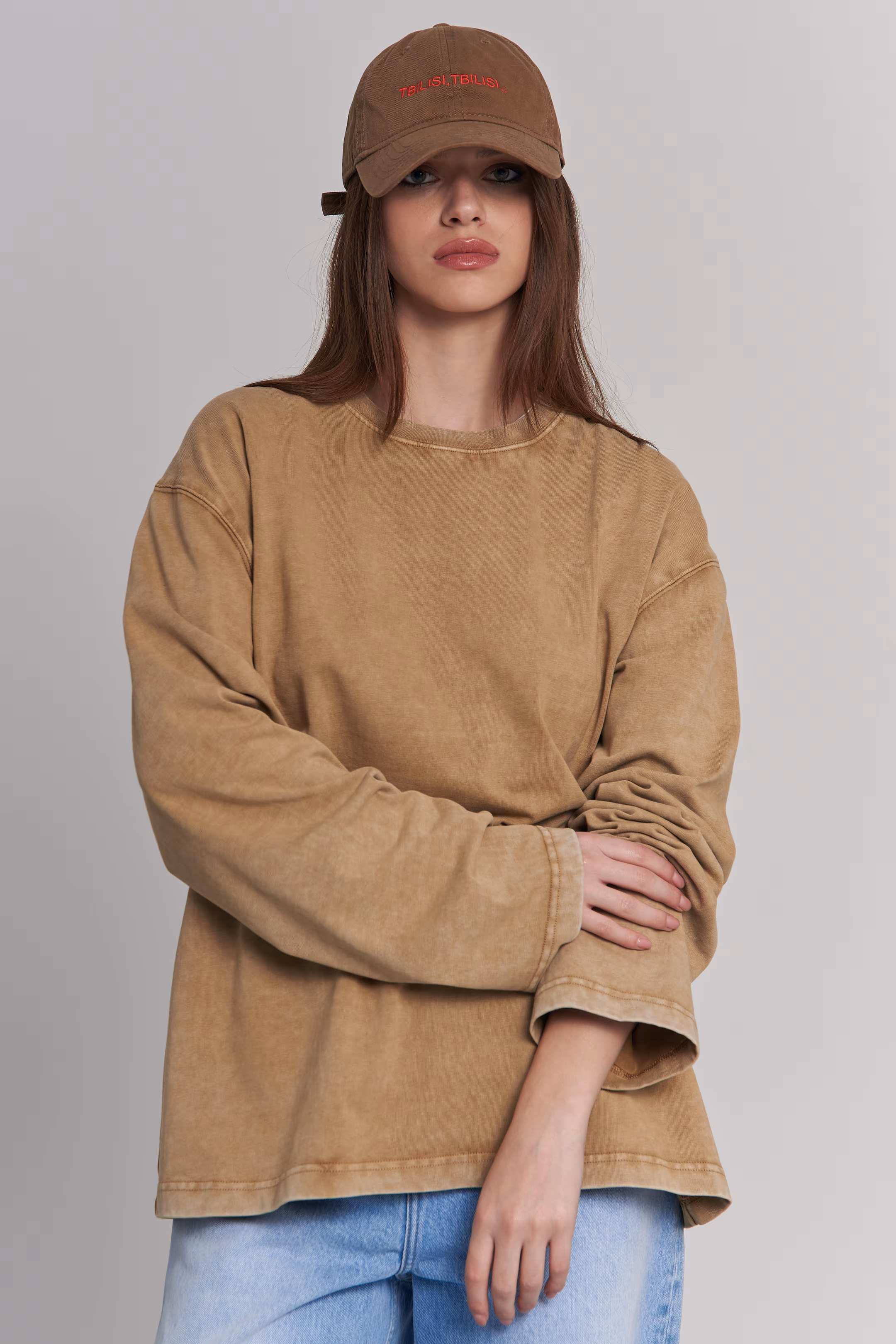 Oversized longsleeve in dark tan tan color. Faded stone-wash finish. Wide sleeves, ribbed round neckline. 100% cotton. Model measurements: Height 174 cm Chest 88 cm Waist 60 cm Hips 94 cm