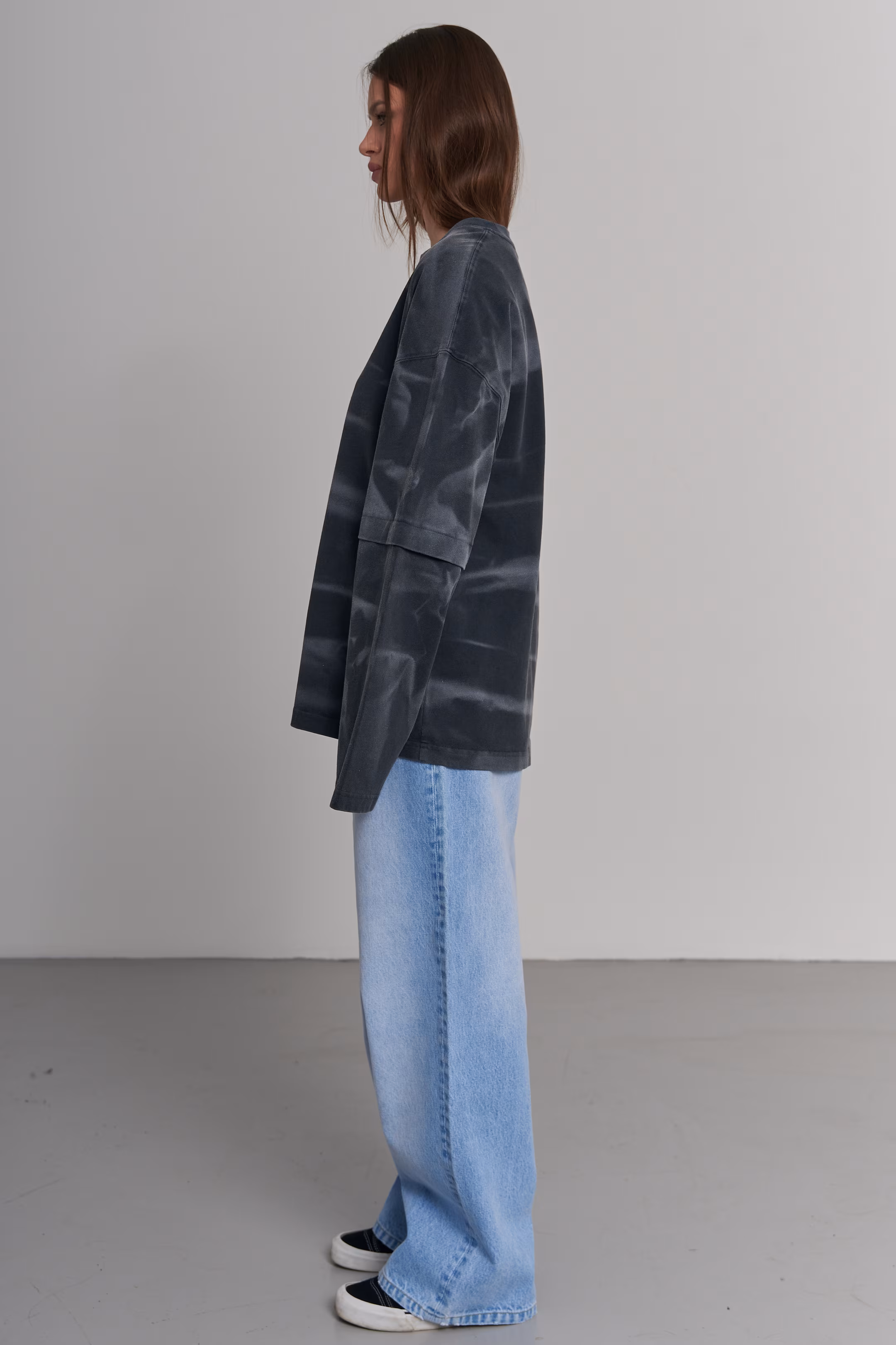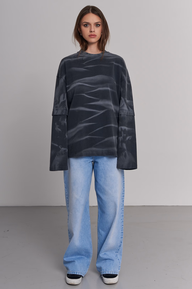 Oversized longsleeve in charcoal grey with a double-layer sleeve design. Wave-like tie-dye pattern across the chest and sleeves. Ribbed round neckline. 100% cotton. Model measurements: Height 174 cm Chest 88 cm Waist 60 cm Hips 94 cm