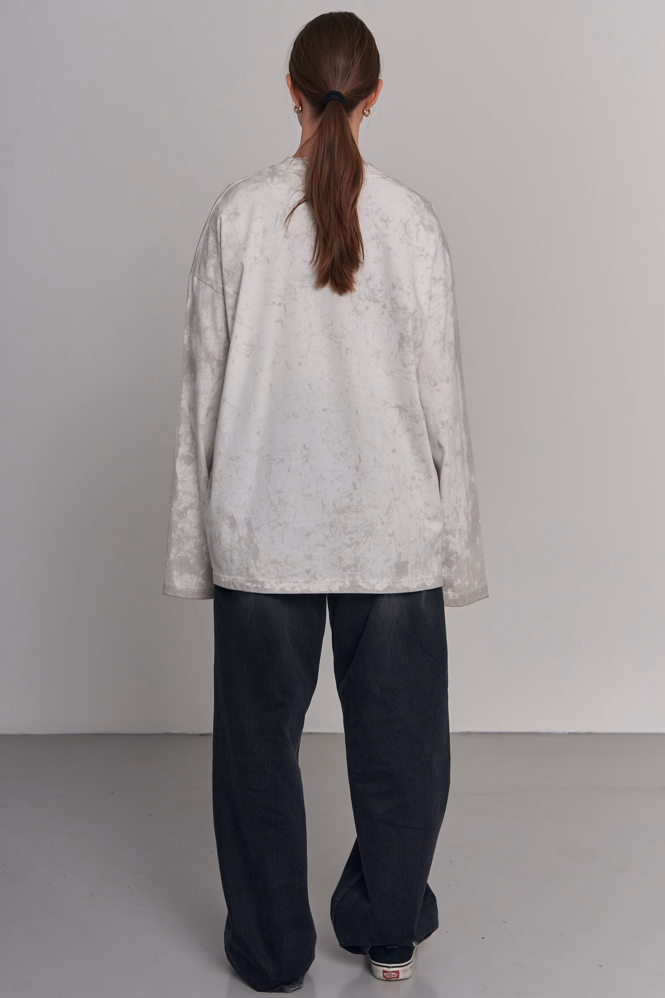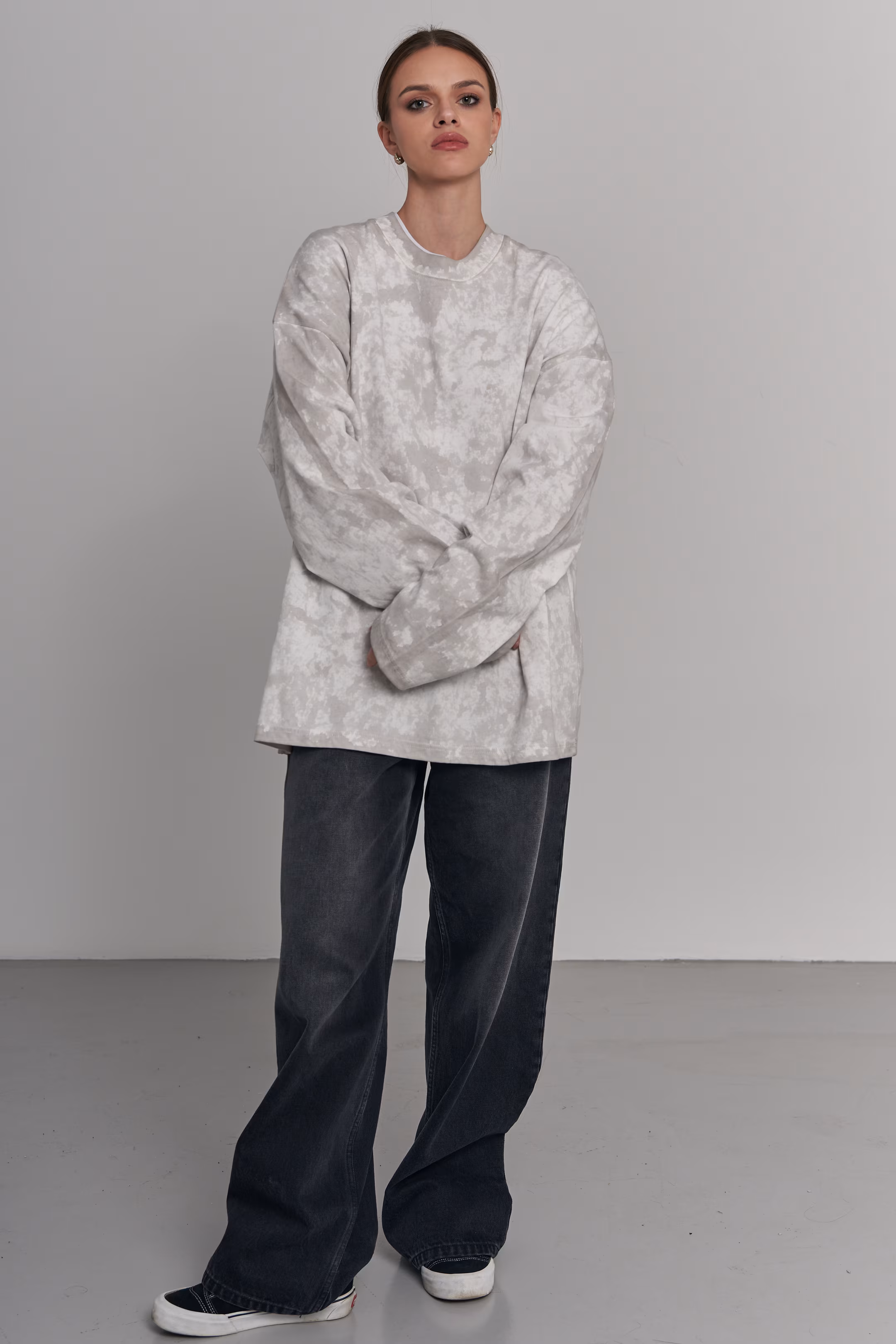 Oversized longsleeve in light grey and white with a marble tie-dye effect. Wide sleeves, ribbed round neckline. 100% cotton. Model measurements: Height 174 cm Chest 88 cm Waist 60 cm Hips 94 cm
