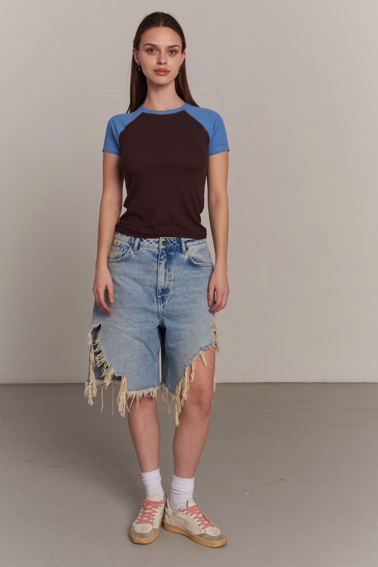 Make a statement with this trendy fitted t-shirt featuring a brown body and striking contrast blue sleeves. The flattering, figure-hugging cut brings a retro-inspired baby tee aesthetic to your wardrobe. Made from soft, stretchy fabric, it guarantees both a perfect fit and exceptional comfort.