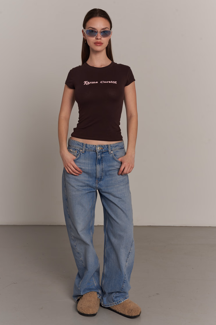 Embrace a nostalgic, early 2000s aesthetic with this licorice fitted t-shirt. Made from a comfortable and stretchy 100% cotton blend, it features a pink Karma Curator print on the chest that adds a playful touch. The flattering cropped silhouette pairs beautifully with low-rise or baggy jeans. Model measurements: height 176 cm, chest 82 cm, waist 60 cm, hips 89 cm. Wearing size M.