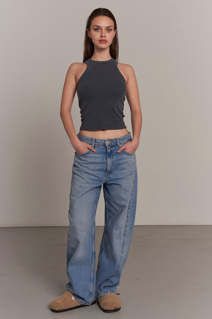 Create sophisticated daily looks with this ribbed tank top. Crafted from premium breathable cotton, this jet black piece boasts a refined halter neckline that eleganty highlights the shoulders. Its sleek, form-fitting silhouette guarantees enduring comfort and effortless pairing with your favorite trousers or jeans.
