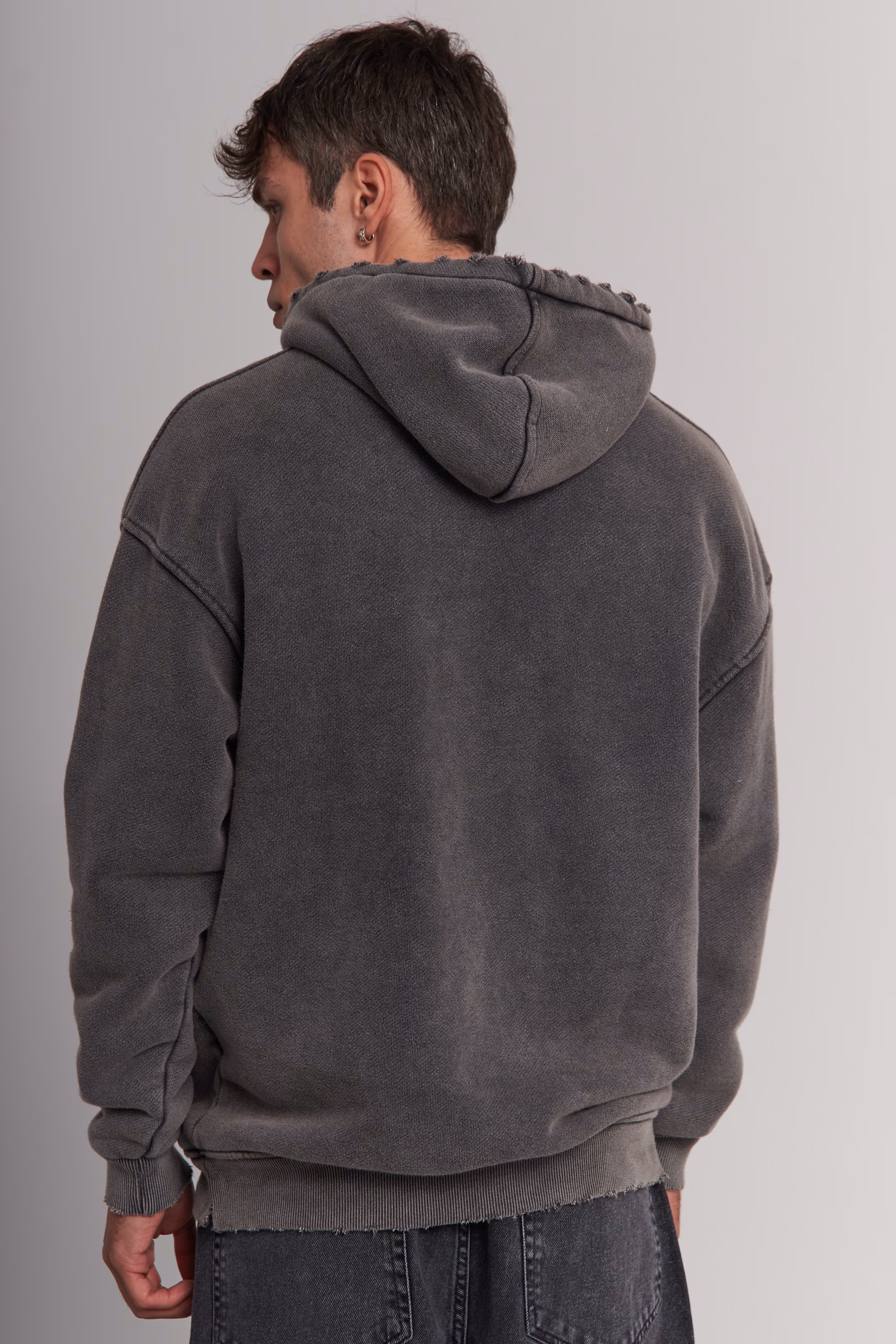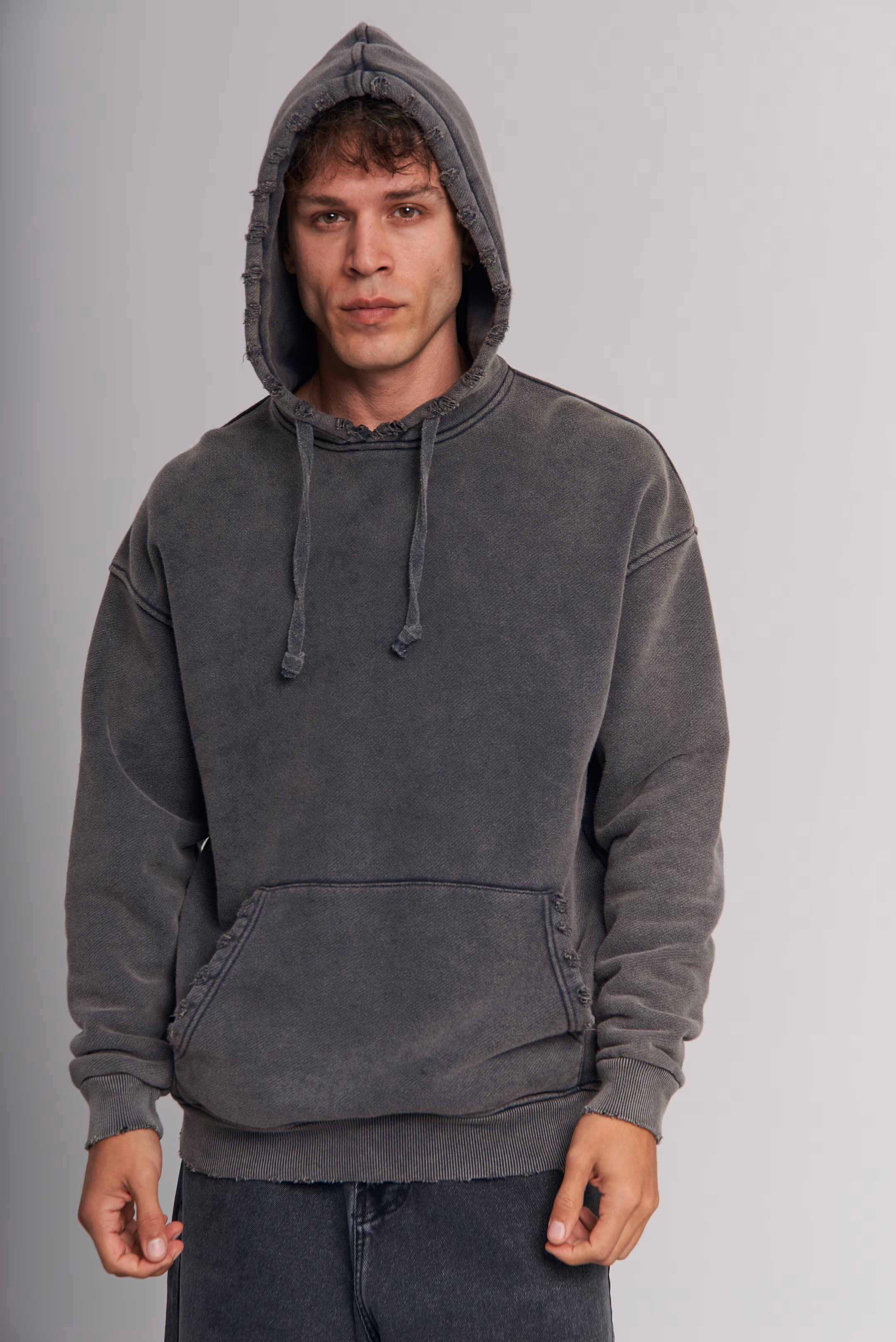 Inject some edge into your casual lineup with this distressed oversized hoodie. Featuring deliberate fraying along the edges and a deep washed onyx hue, it delivers a stylishly rugged streetwear aesthetic.