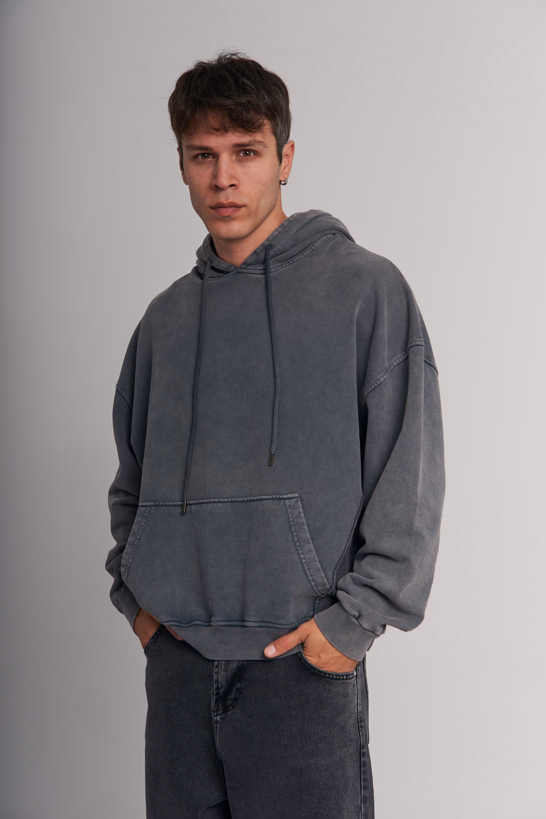 Oversized hoodie in washed dark slate grey. Drawstring hood. Kangaroo pocket. Ribbed cuffs and hem. No print. 100% cotton. Model measurements: Height 185 cm Chest 100 cm Waist 84 cm Hips 97 cm