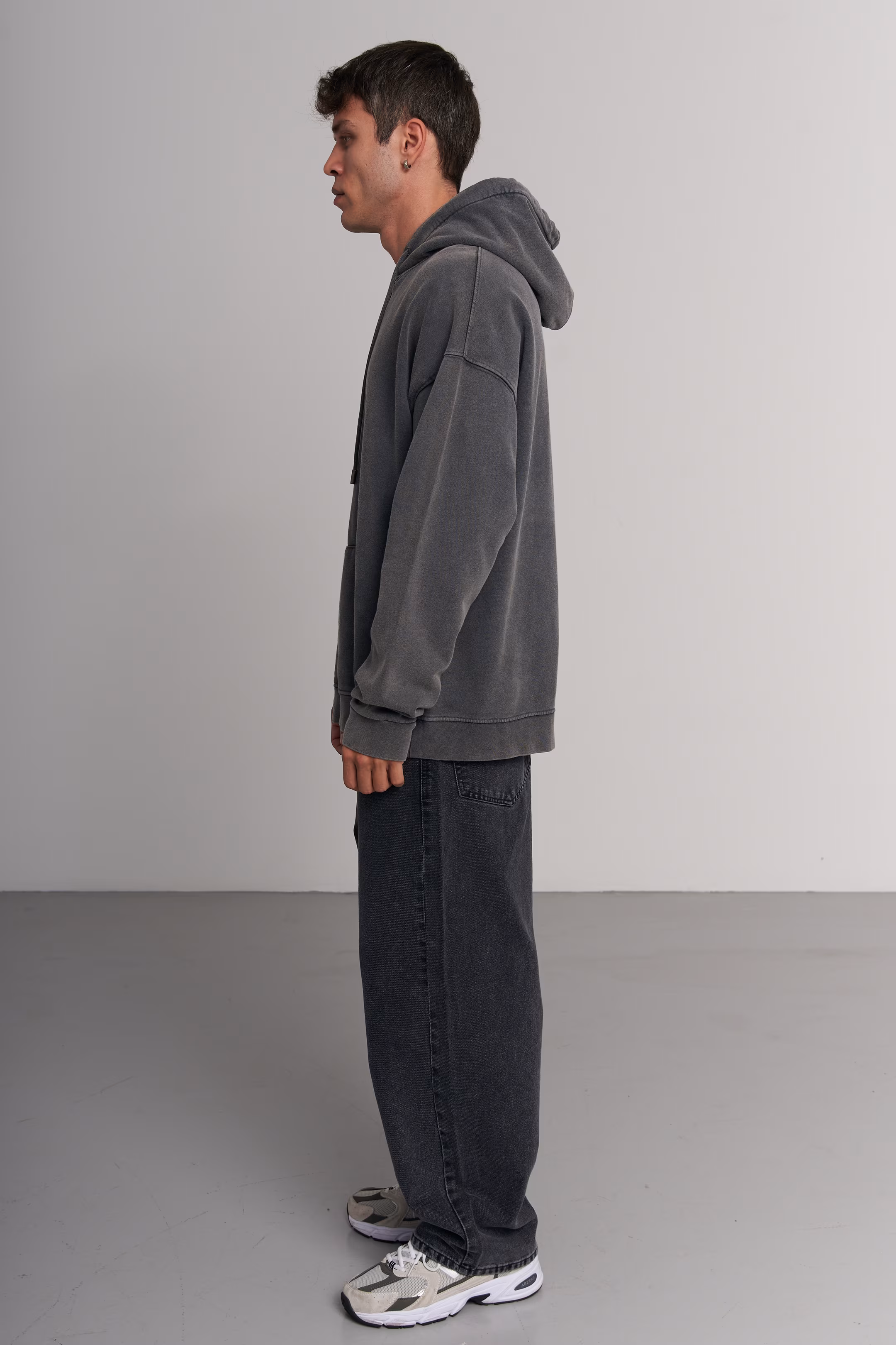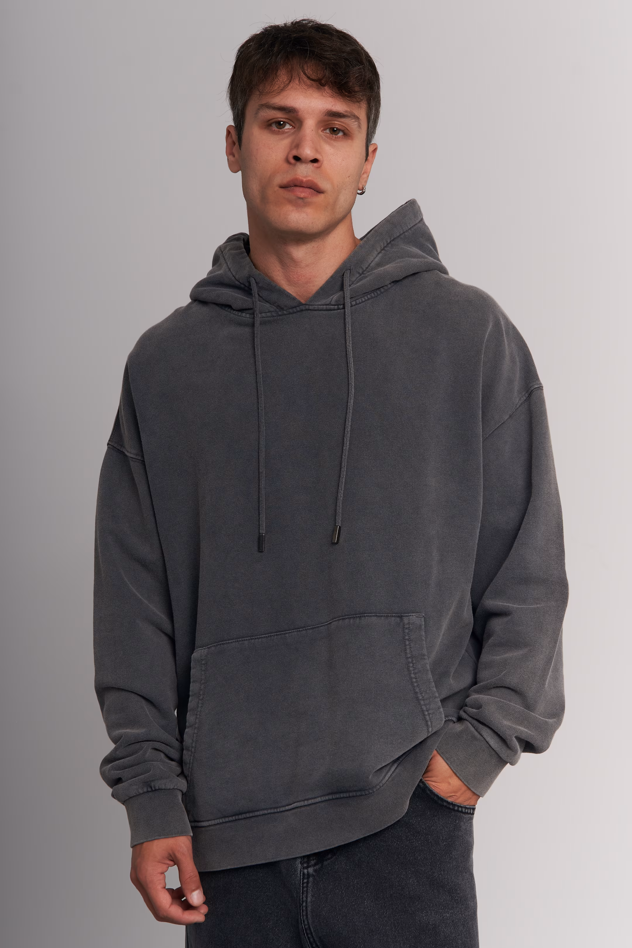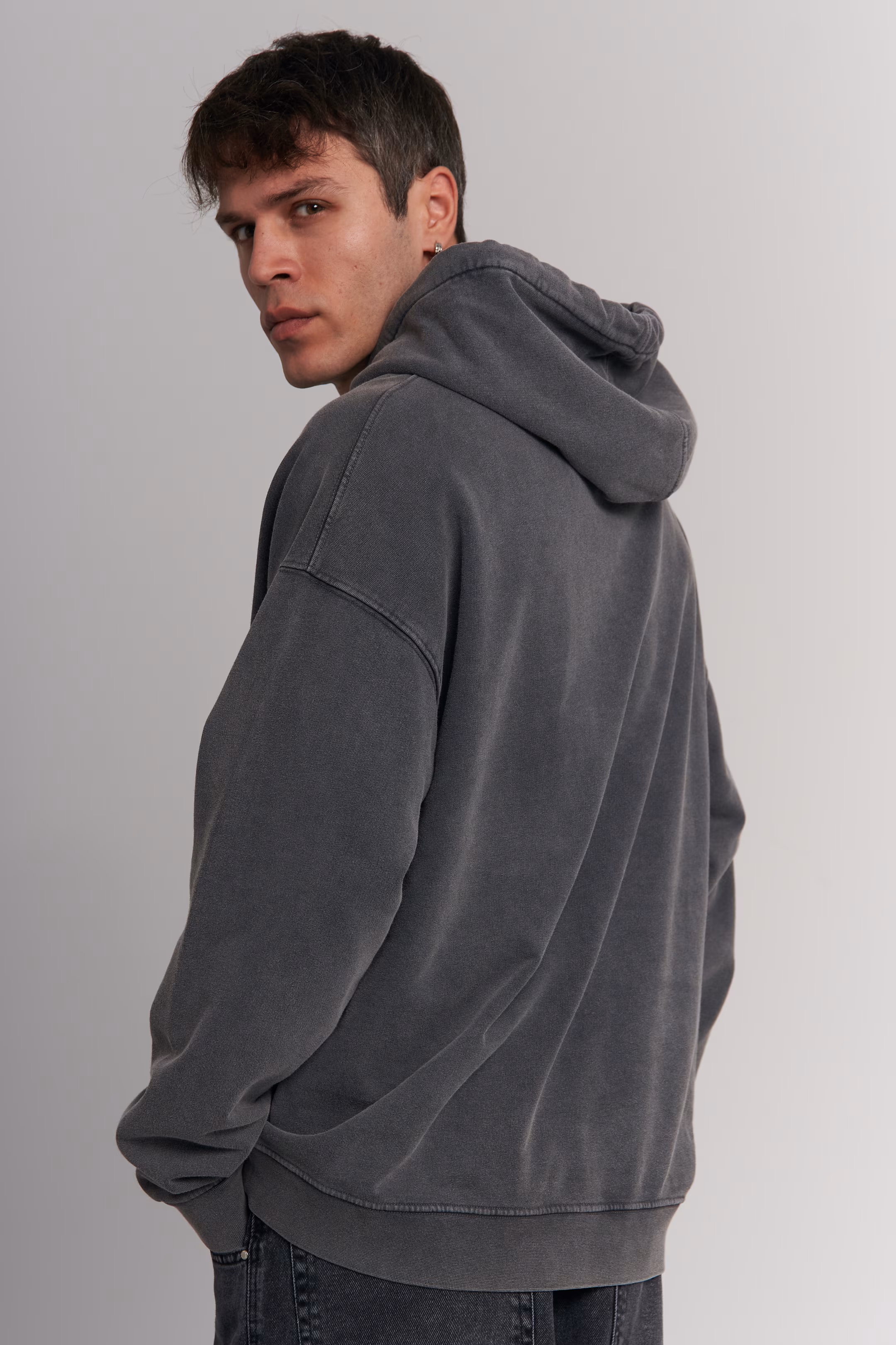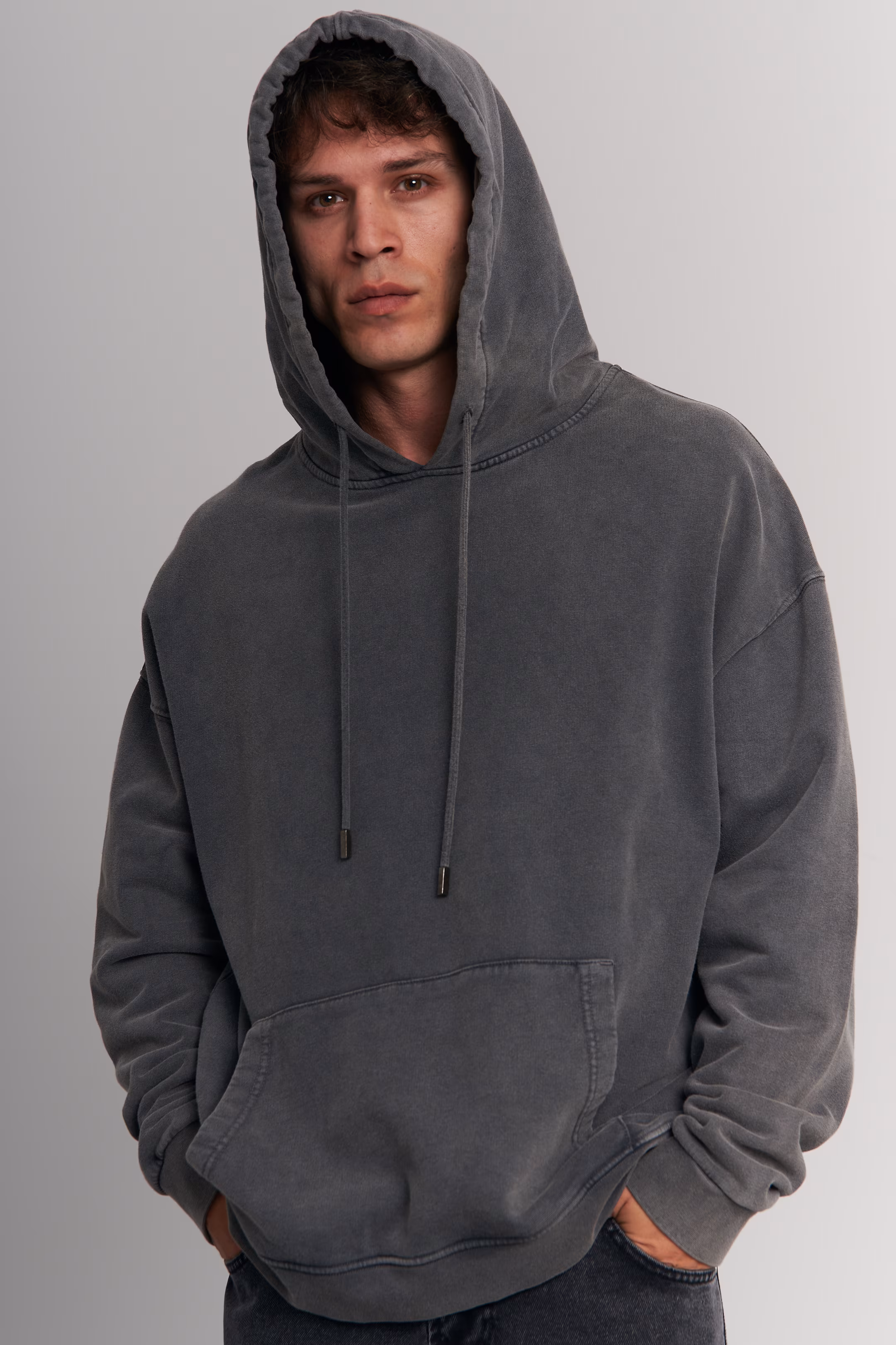 Oversized hoodie in charcoal. Drawstring hood with metal tips. Kangaroo pocket. Ribbed cuffs and hem. No print. 100% cotton. Model measurements: Height 185 cm Chest 100 cm Waist 84 cm Hips 97 cm