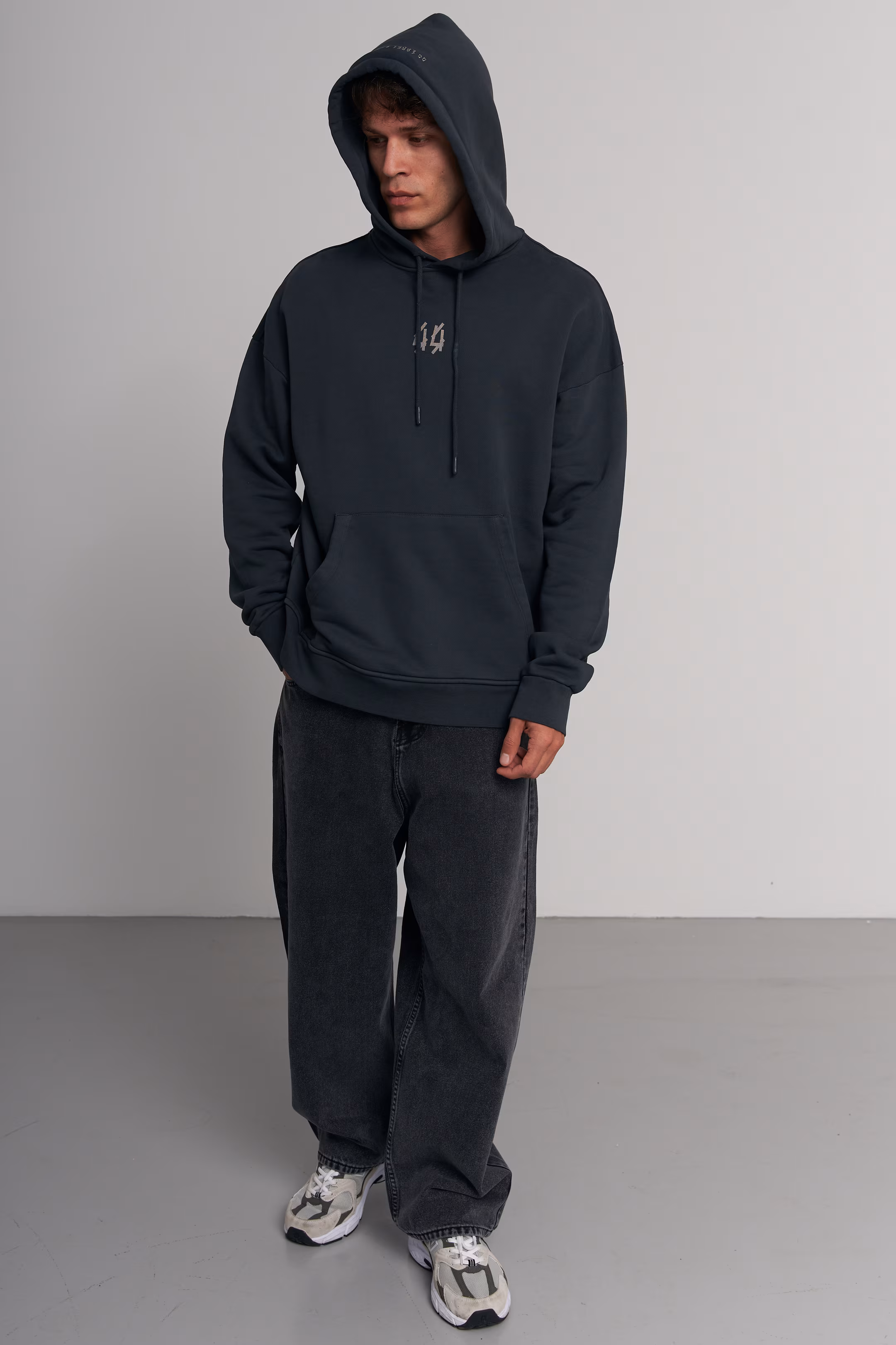 Oversized hoodie in matte black. Gothic-style "44" print on the left chest. Drawstring hood. Kangaroo pocket. Ribbed cuffs and hem. 100% cotton. Model measurements: Height 185 cm Chest 100 cm Waist 84 cm Hips 97 cm