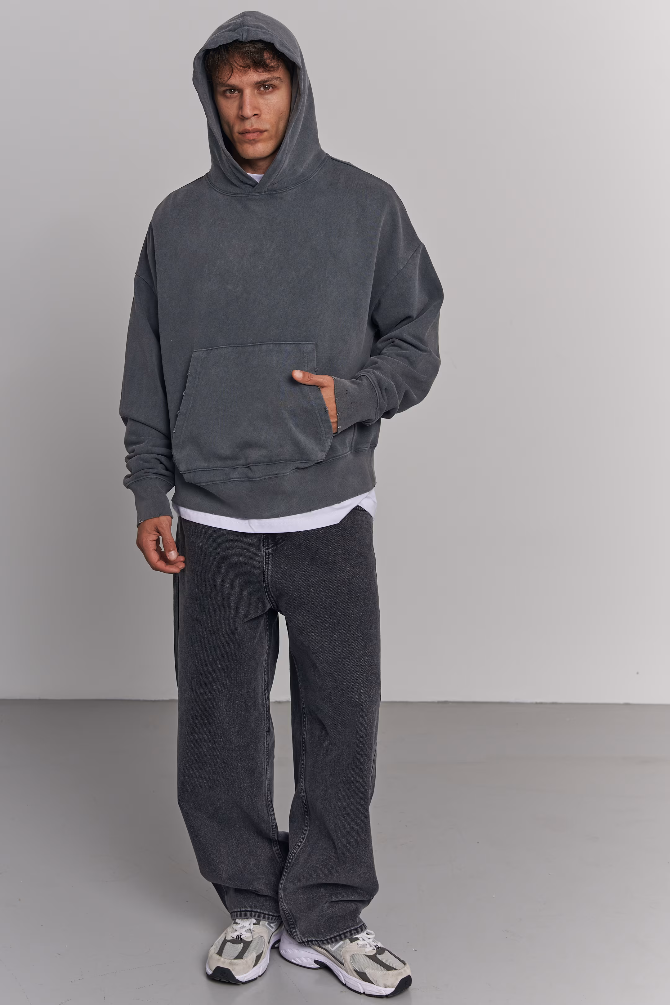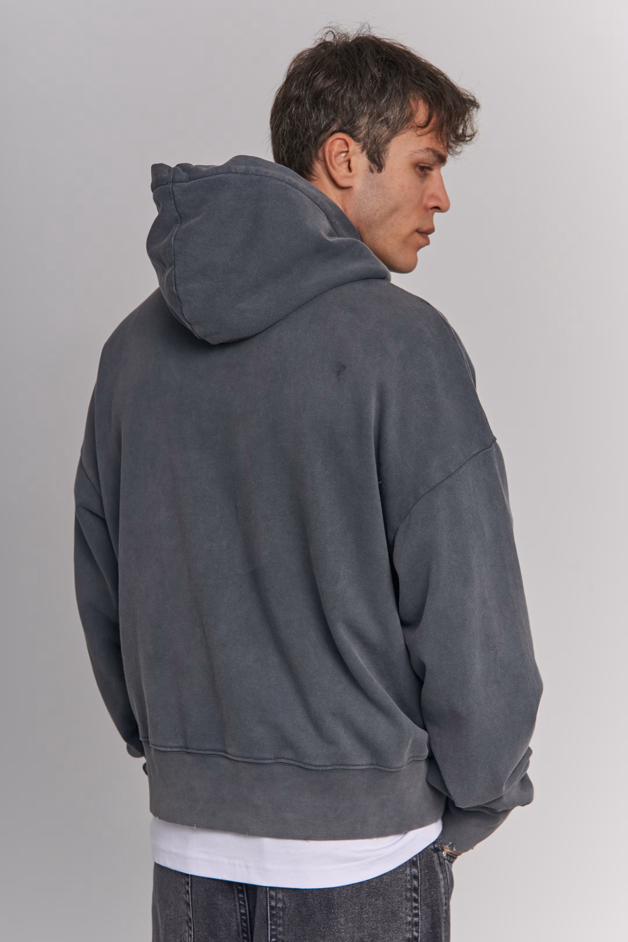 Oversized hoodie in charcoal. Stone-wash effect. Trapezoidal kangaroo pocket. Hood. Ribbed cuffs and hem. No print. 100% cotton. Model measurements: Height 185 cm Chest 100 cm Waist 84 cm Hips 97 cm