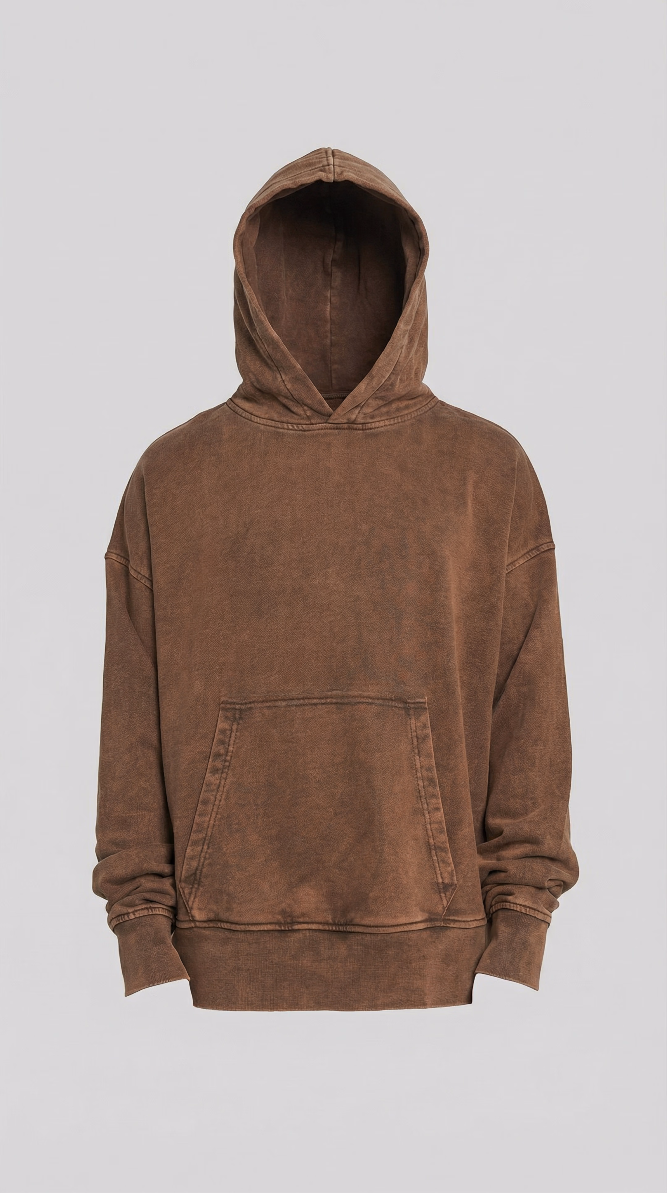Oversized pullover hoodie in washed light grey. Stone-wash effect visible across the fabric. Hood, kangaroo pocket. Ribbed cuffs and hem. 100% cotton. Model measurements: Height 185 cm Chest 100 cm Waist 84 cm Hips 97 cm