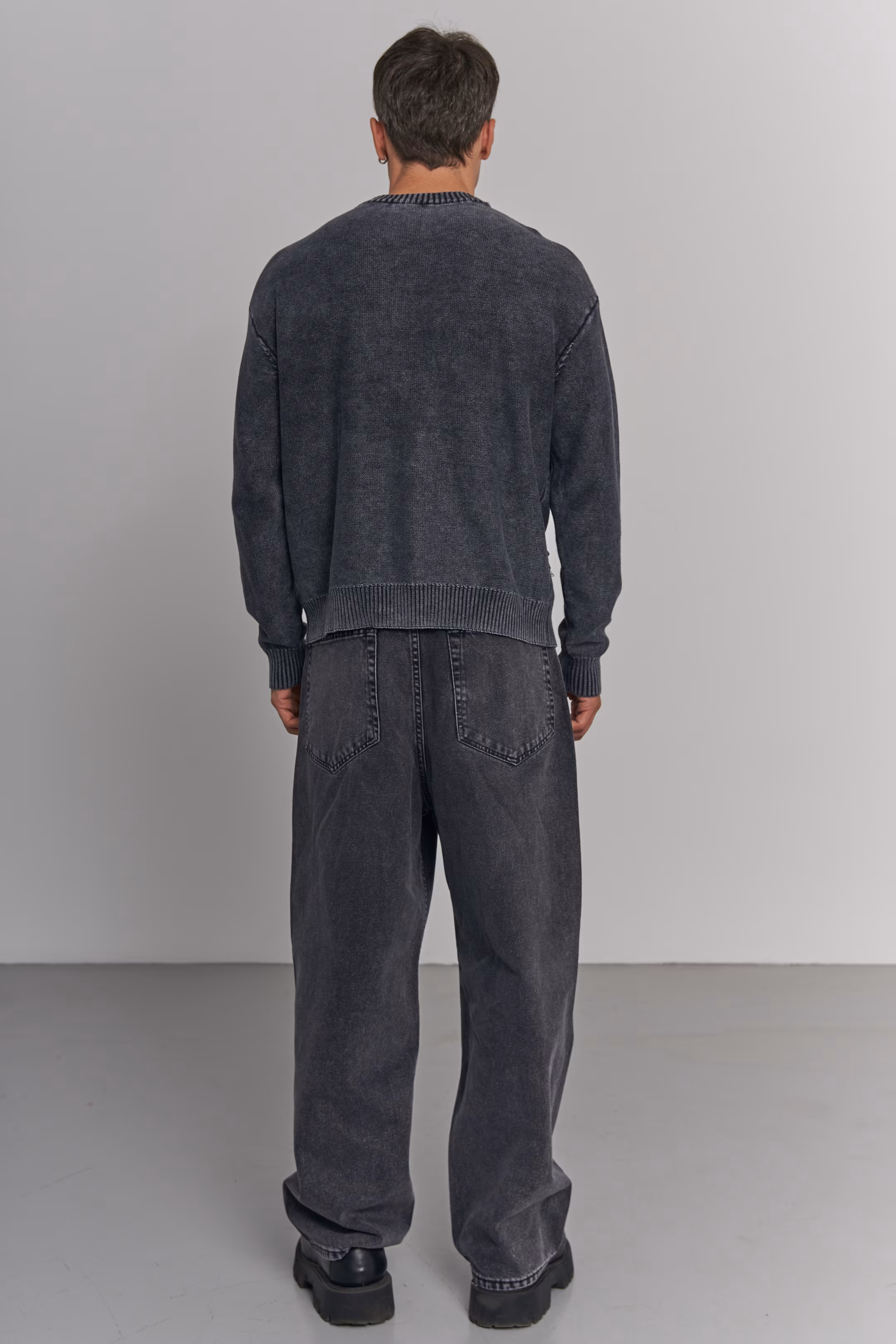 Knit crewneck sweater in jet black. Stone-wash effect across the fabric. Ribbed collar and hem. Ribbed cuffs. Model measurements: Height 185 cm Chest 100 cm Waist 84 cm Hips 97 cm