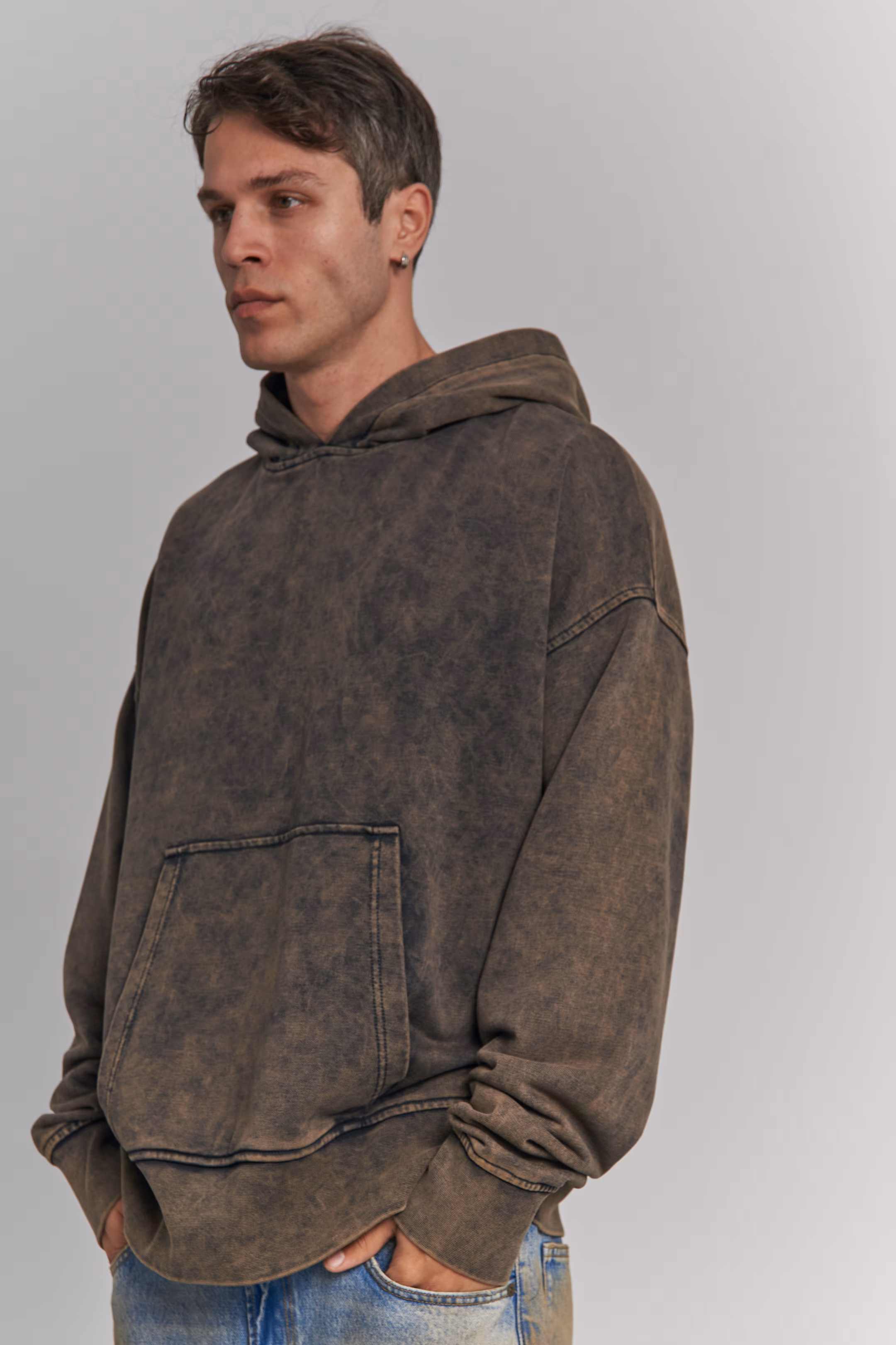 Oversized pullover hoodie in taupe taupe. Stone-wash effect throughout the fabric. Hood, kangaroo pocket. Ribbed cuffs and hem. 100% cotton. Model measurements: Height 185 cm Chest 100 cm Waist 84 cm Hips 97 cm