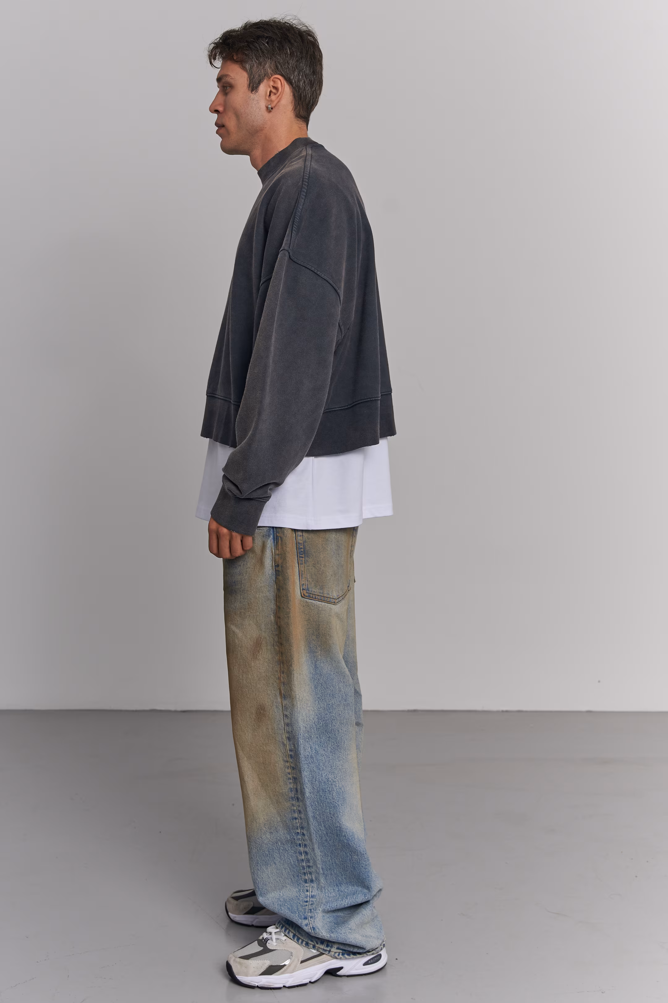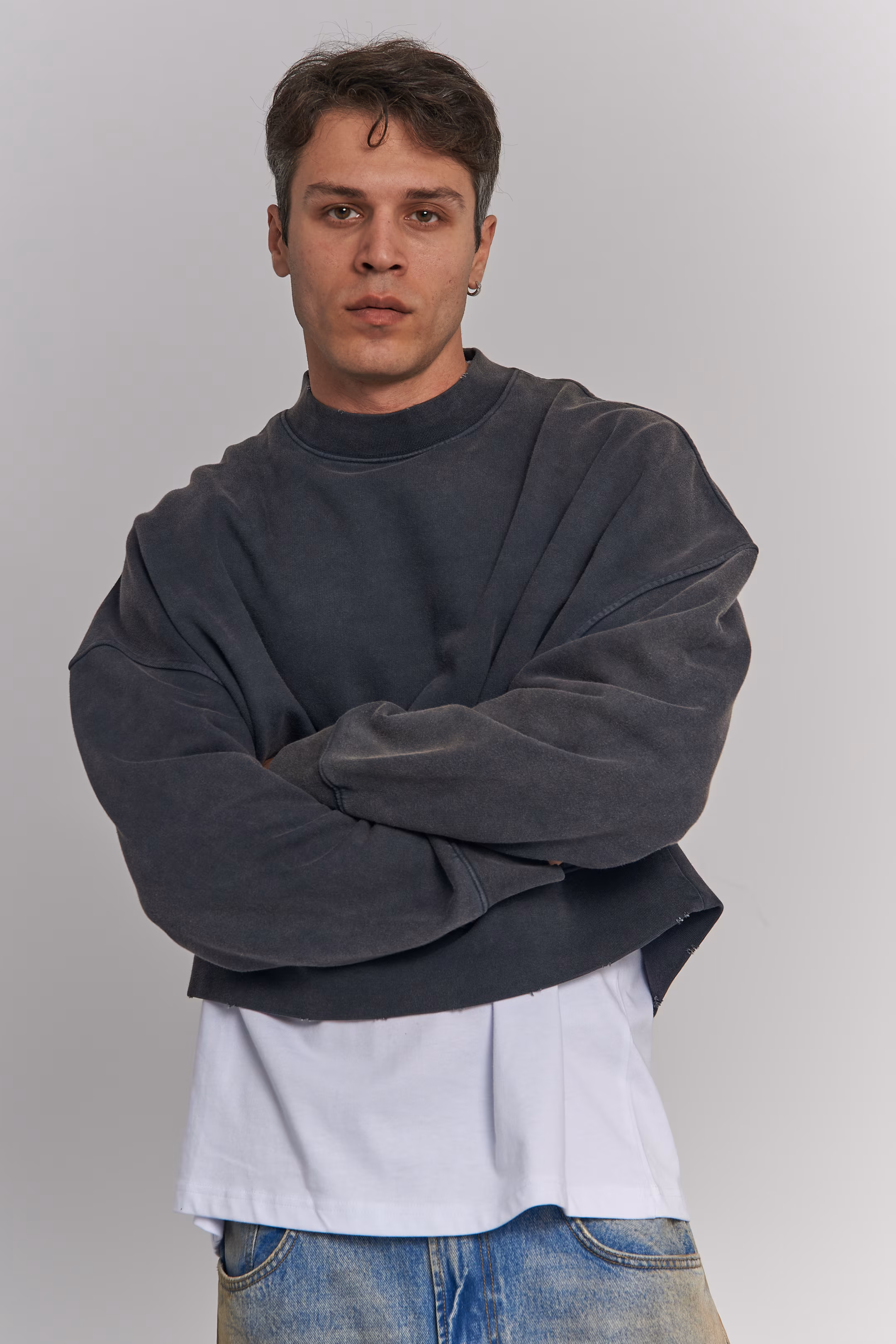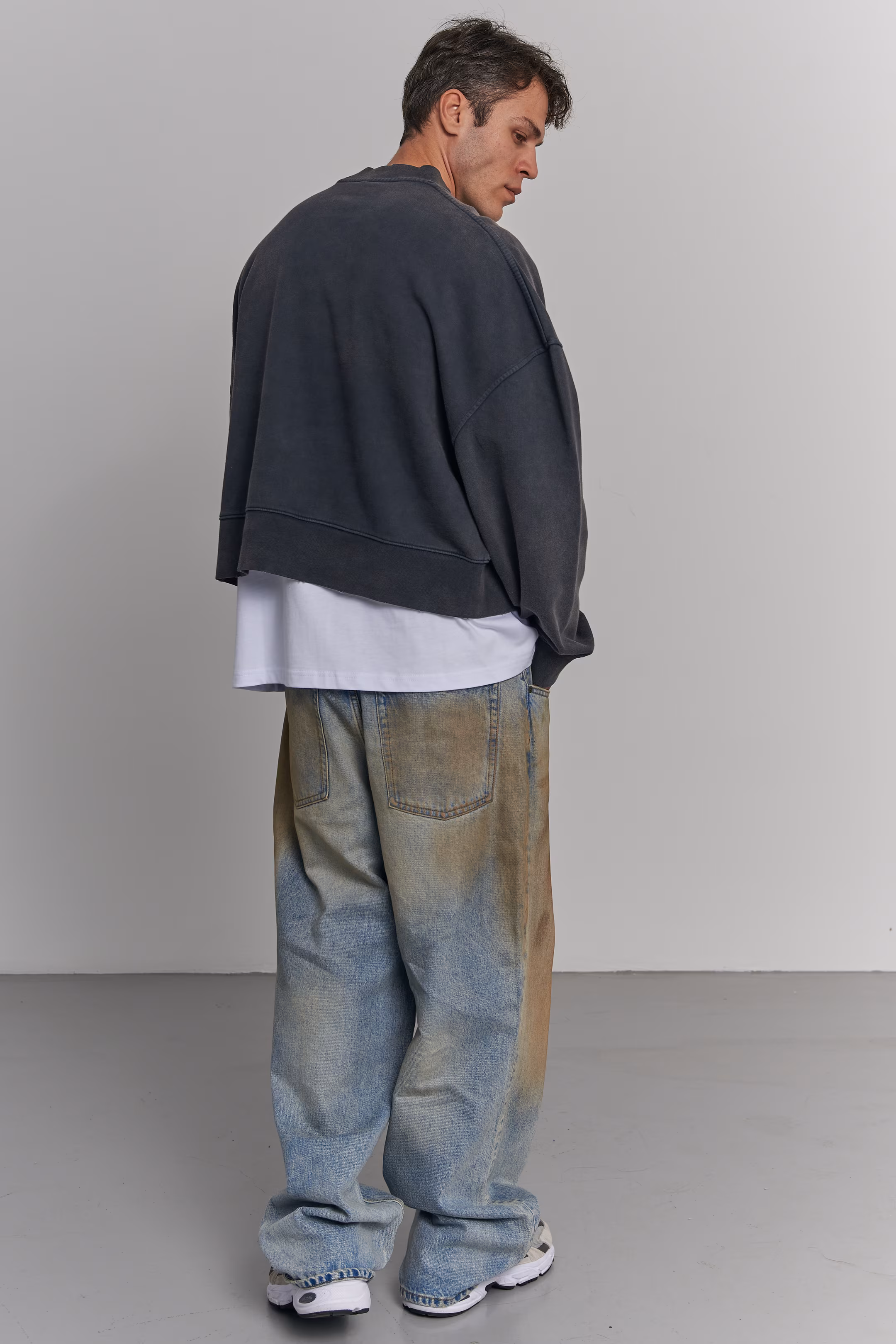 Oversized crewneck sweatshirt in jet black with a slightly raised neckline. Stone-wash effect throughout the fabric. No hood. Ribbed cuffs and hem. 100% cotton. Model measurements: Height 185 cm Chest 100 cm Waist 84 cm Hips 97 cm