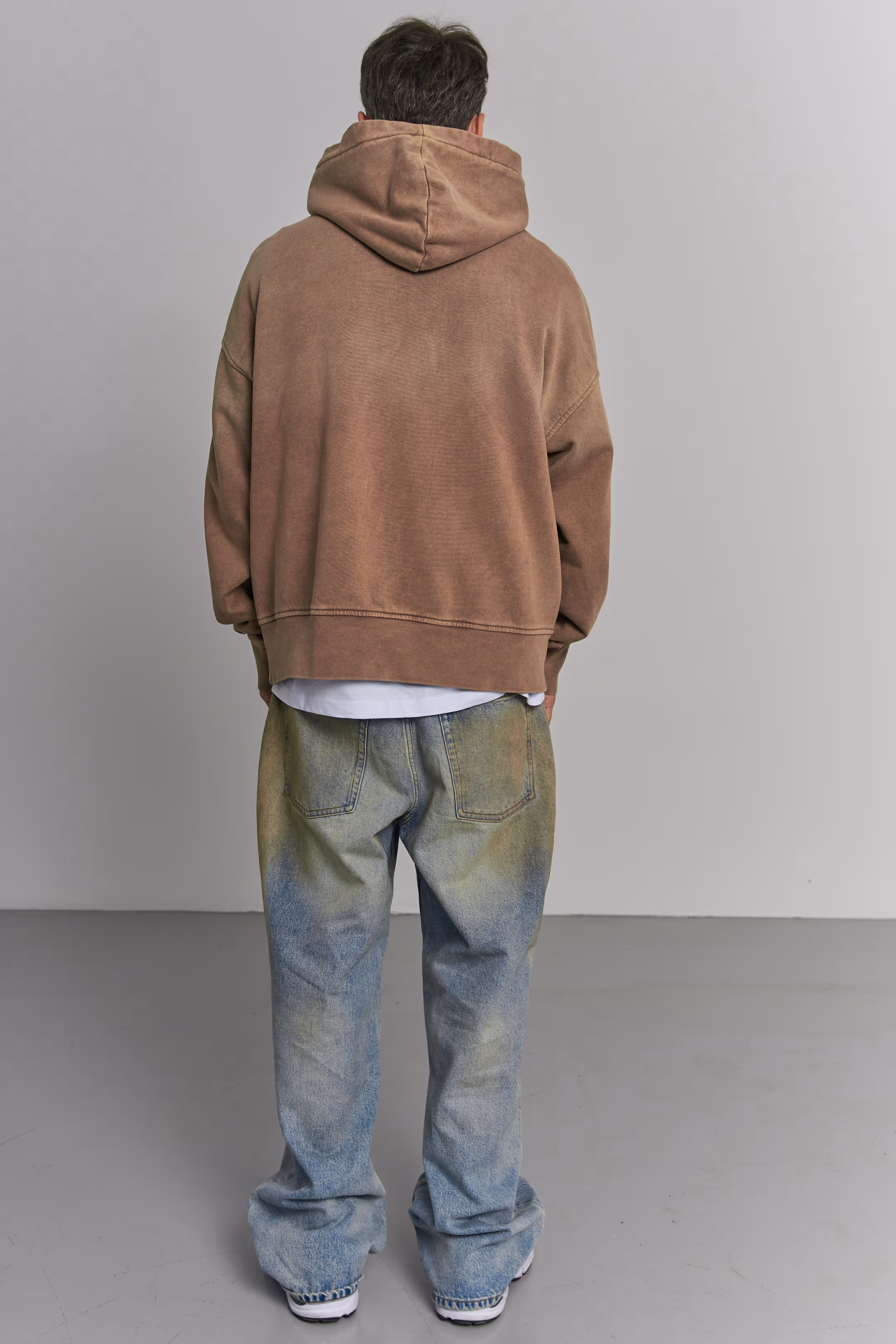 Oversized pullover hoodie in coffee. Paint splatter marks on the front. Stone-wash effect throughout the fabric. Hood, kangaroo pocket. Ribbed cuffs and hem. 100% cotton.