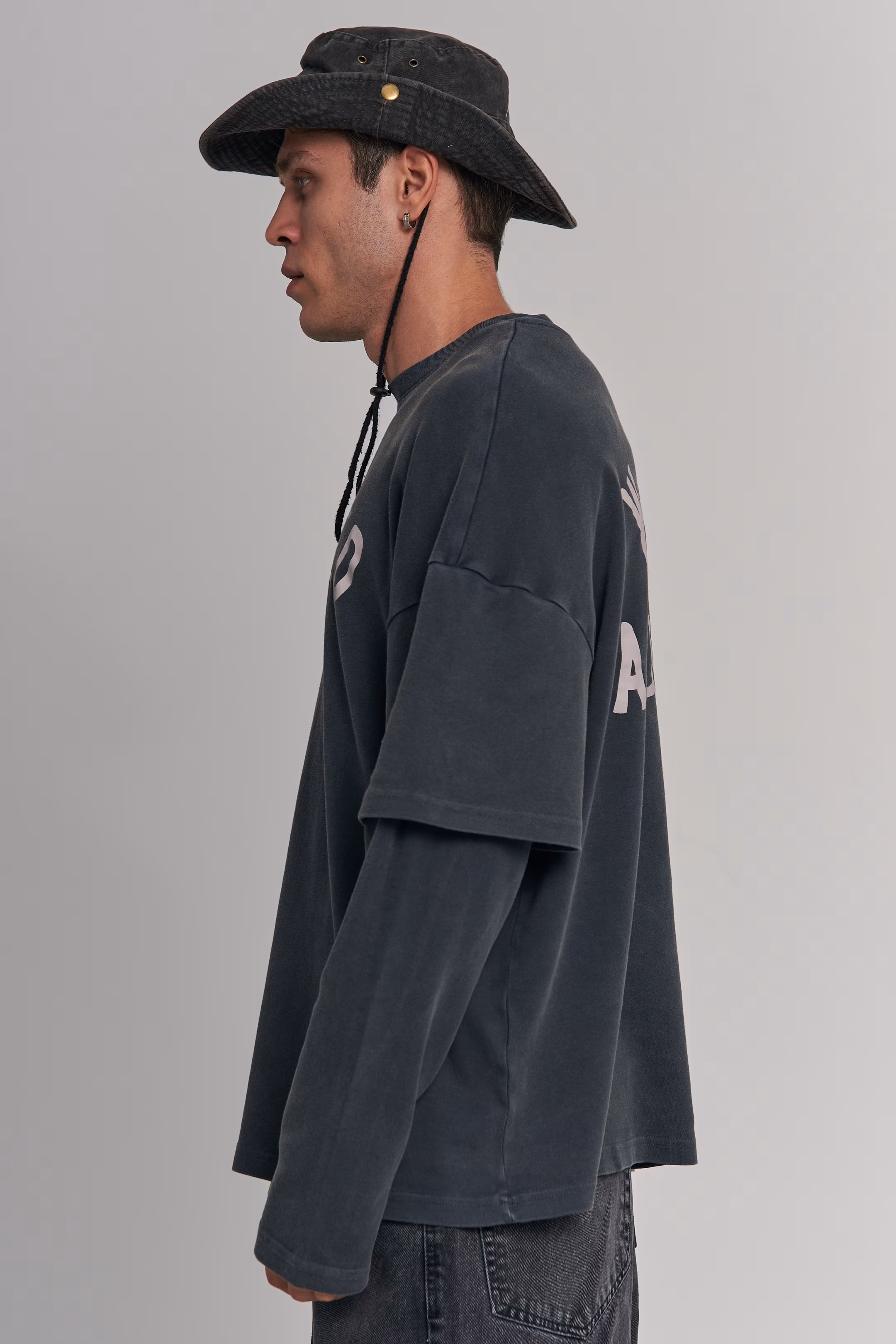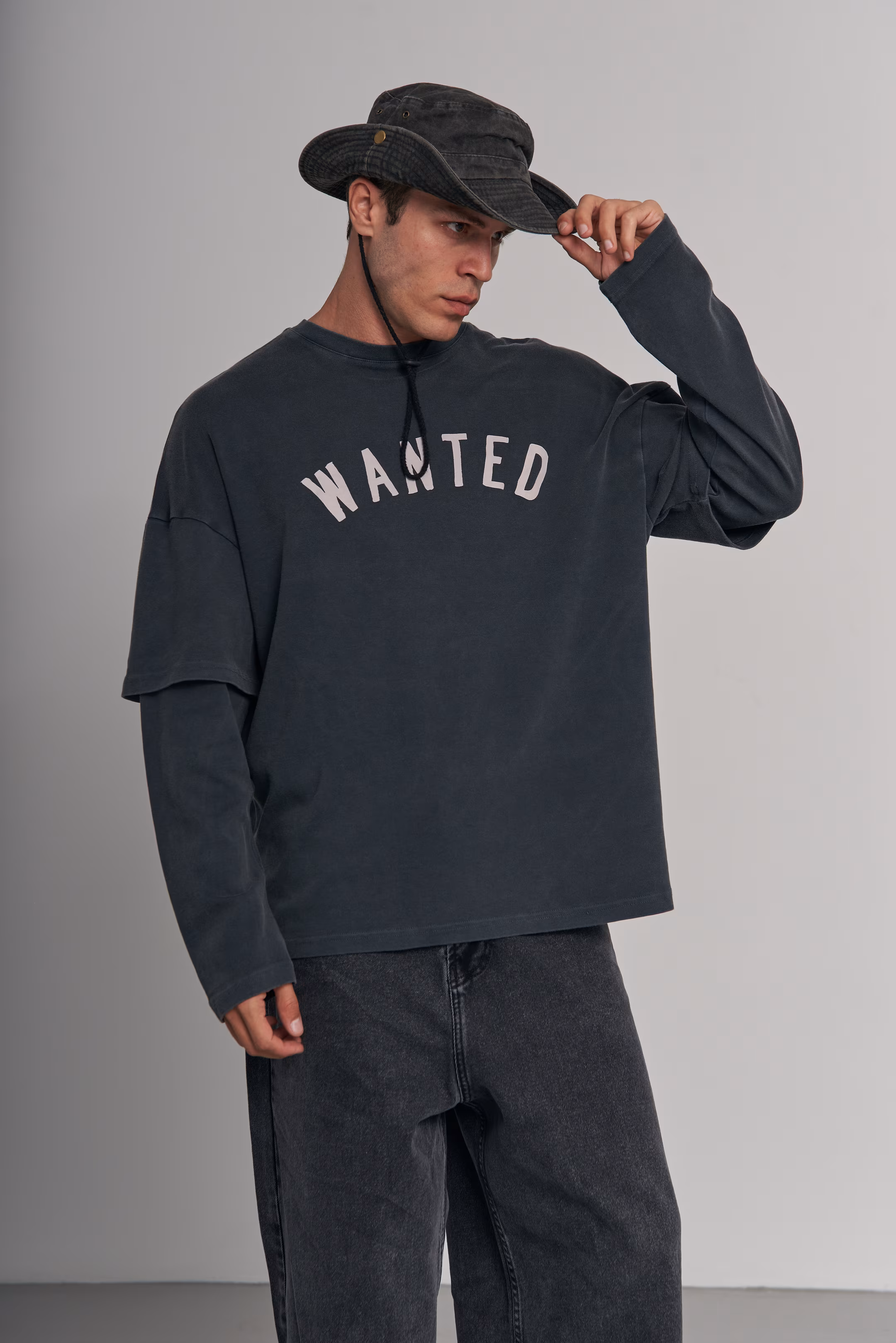 Oversized longsleeve in matte black grey with a double-layer sleeve effect. WANTED graphic print in white on the chest. Ribbed round neckline. 100% cotton. Model measurements: Height 185 cm Chest 100 cm Waist 84 cm Hips 97 cm