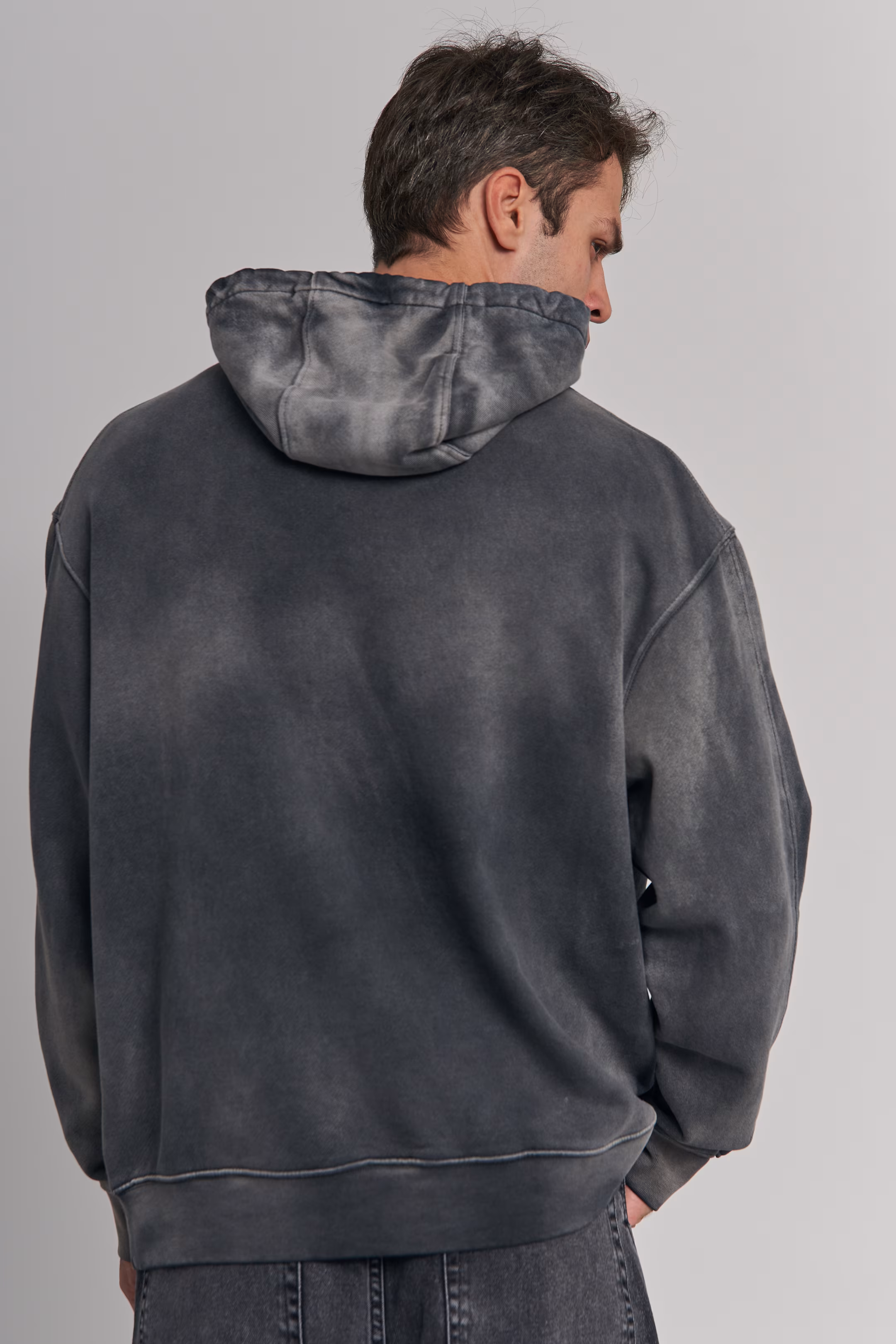 Oversized hoodie in jet black grey with a stone-wash finish. Lighter grey gradient on the chest. Distressed details with small frayed spots. Hood with drawstrings, contrast-toned kangaroo pocket. Ribbed cuffs and hem. 100% cotton.