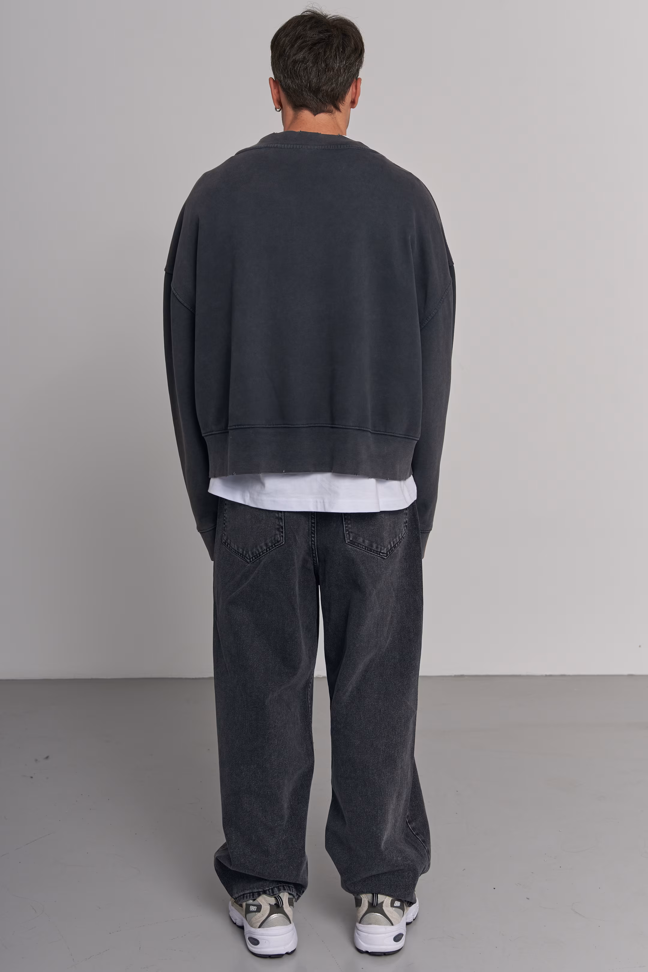 Oversized sweatshirt in jet black grey with a stone-wash effect. Features a large white angel graphic print on the chest. Ribbed round neckline, cuffs, and hem. 100% cotton.