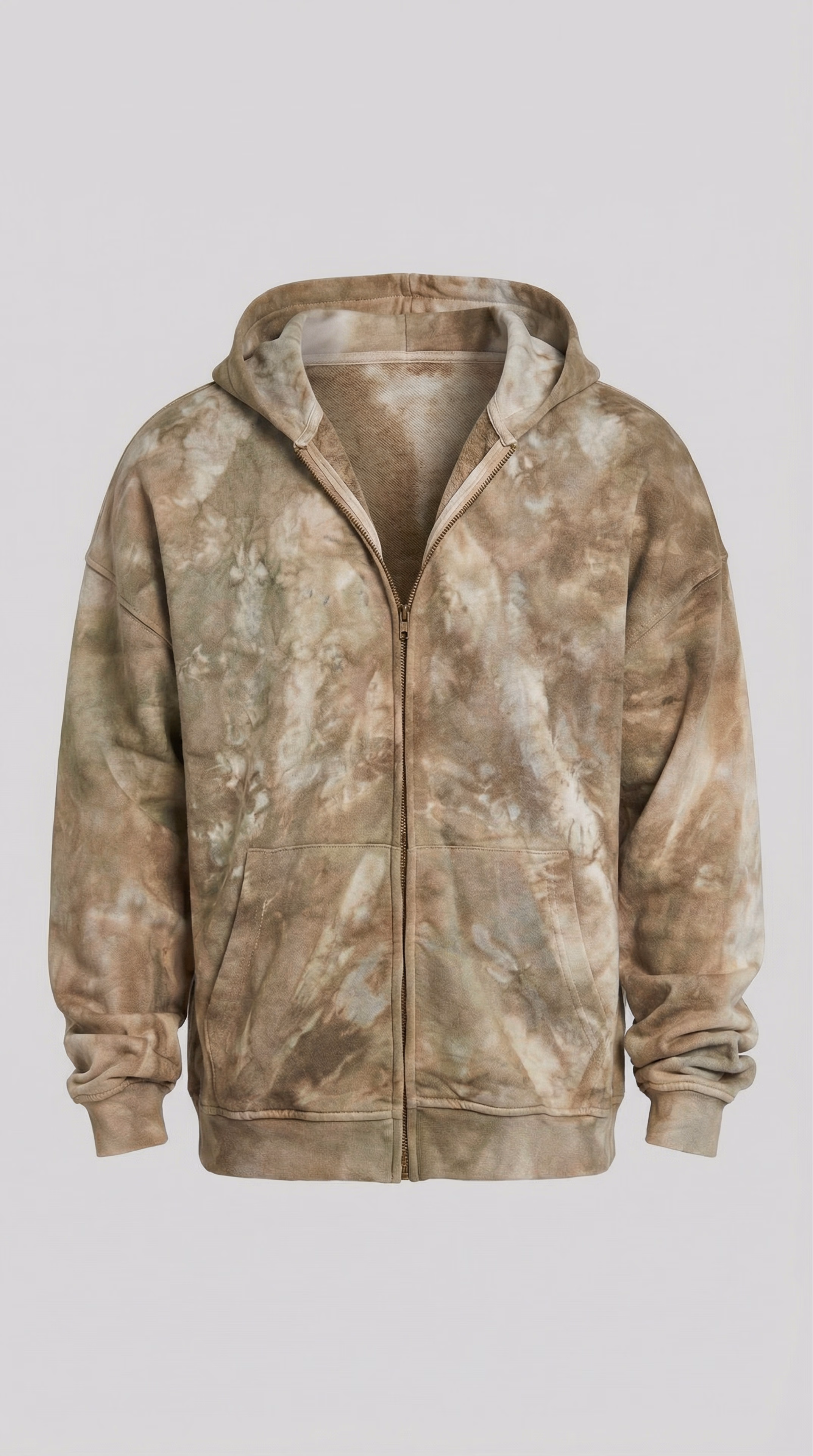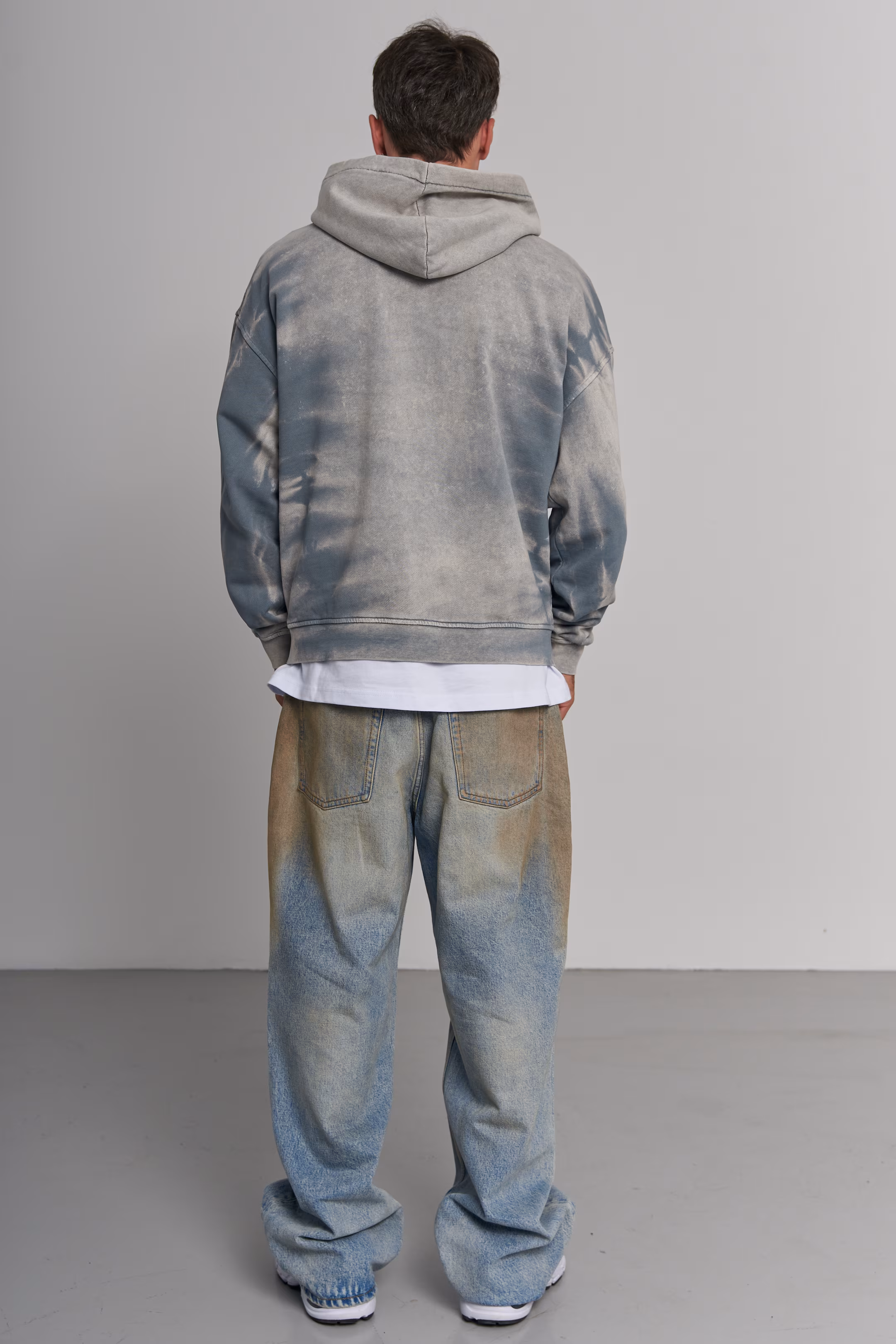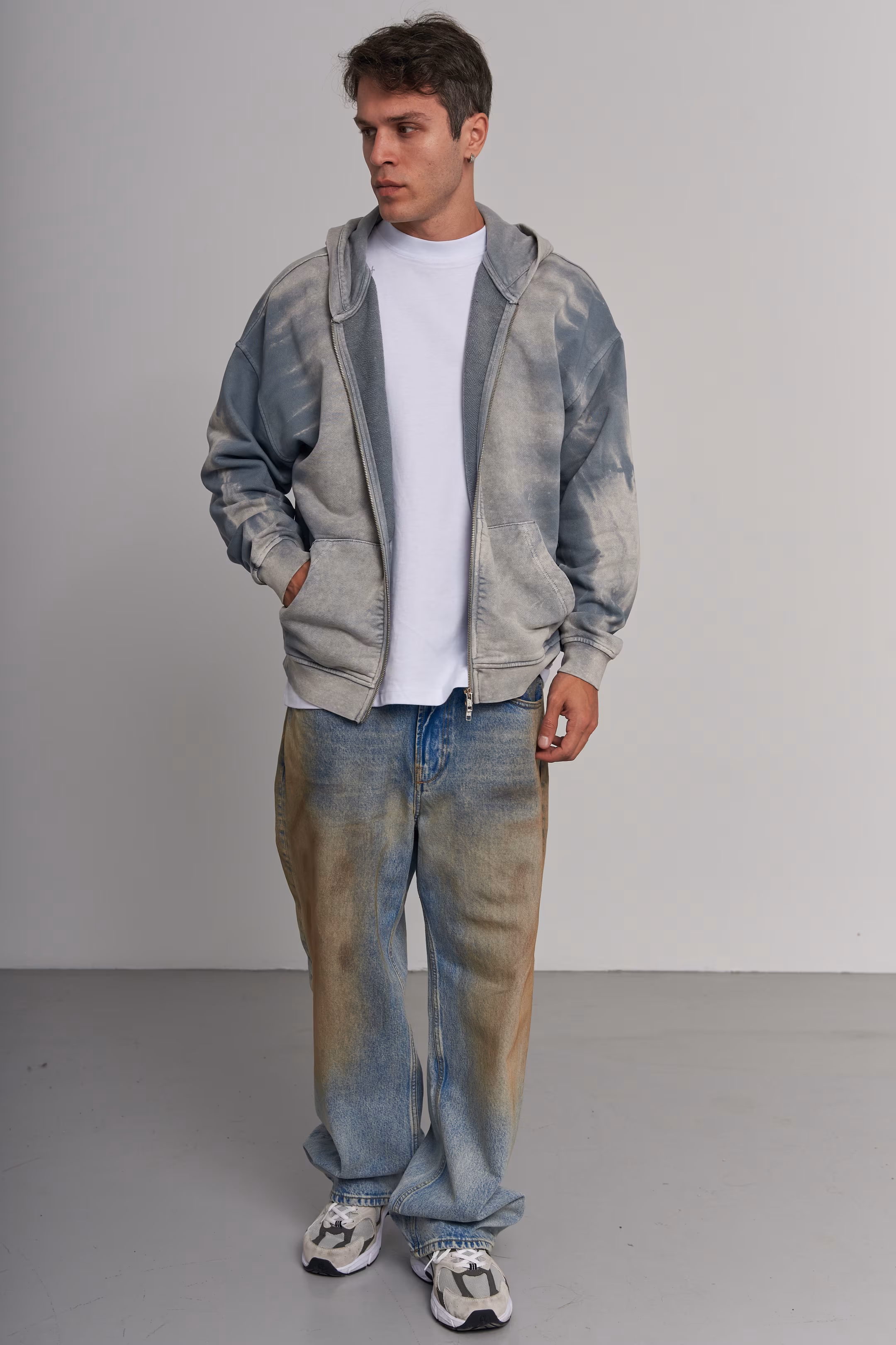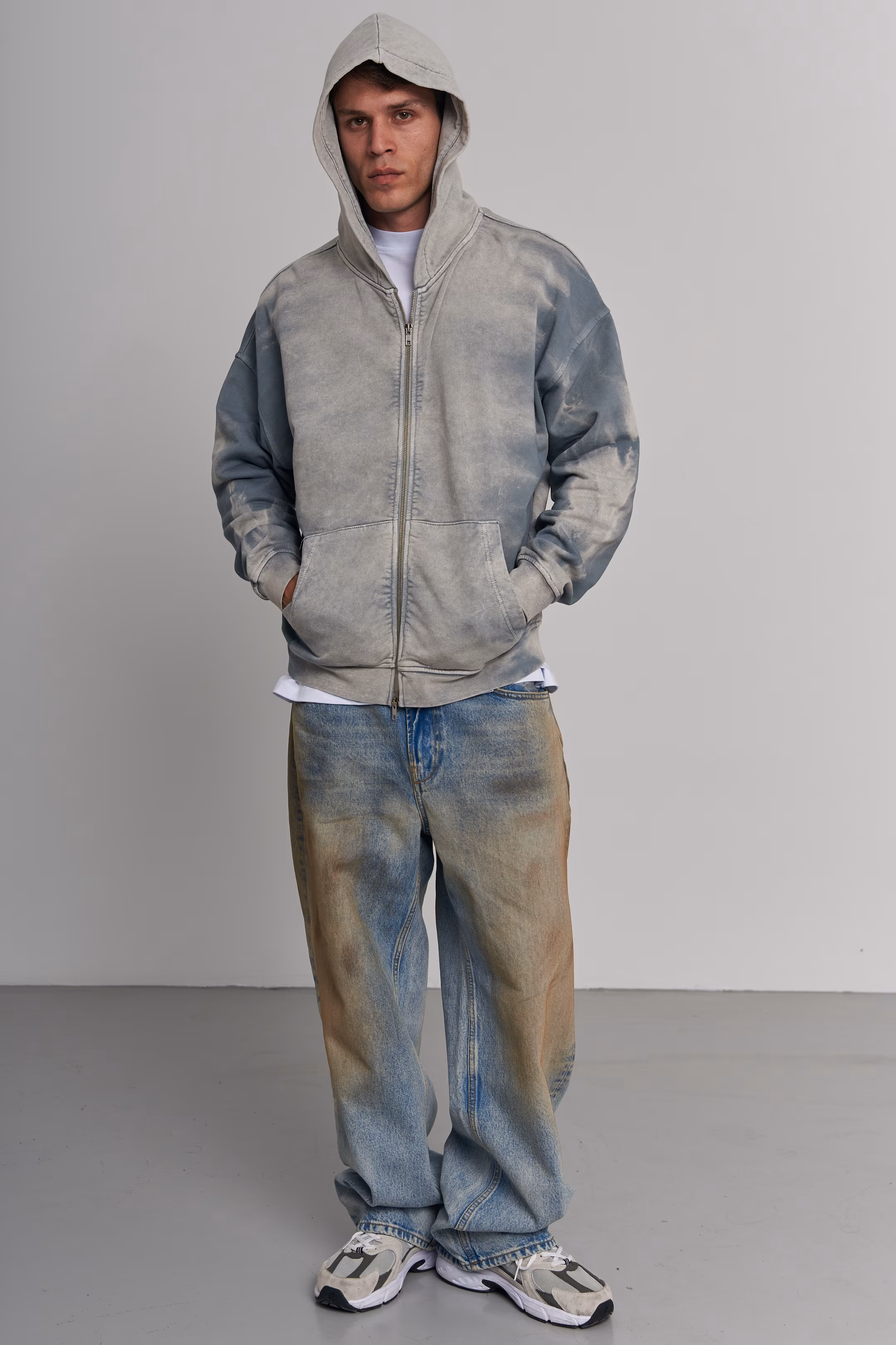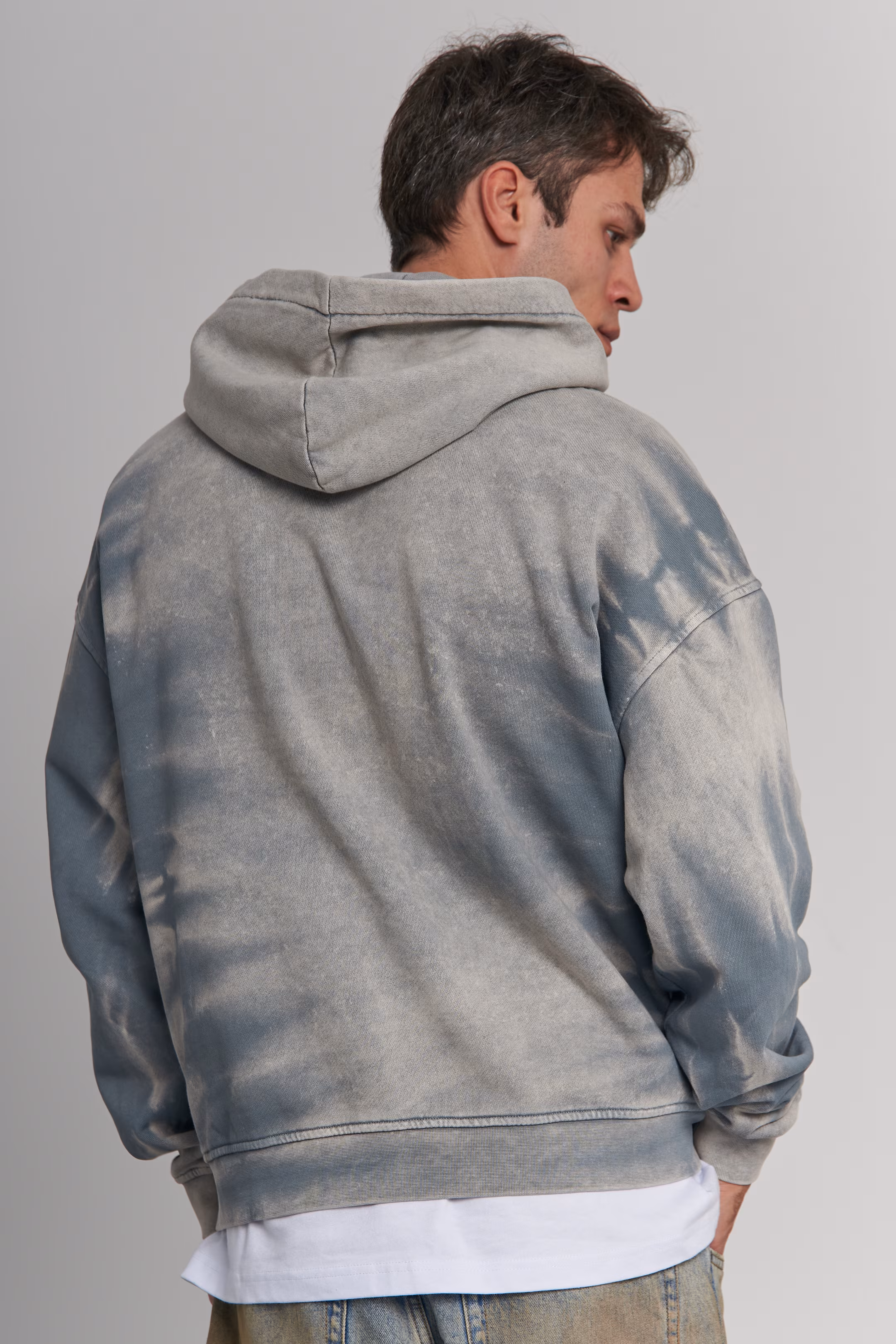 Oversized zip-up hoodie in light grey-blue with a large cloudy cloud-wash pattern. Hood, front zipper, kangaroo pocket. Ribbed cuffs and hem. 100% cotton. Model measurements: Height 185 cm Chest 100 cm Waist 84 cm Hips 97 cm