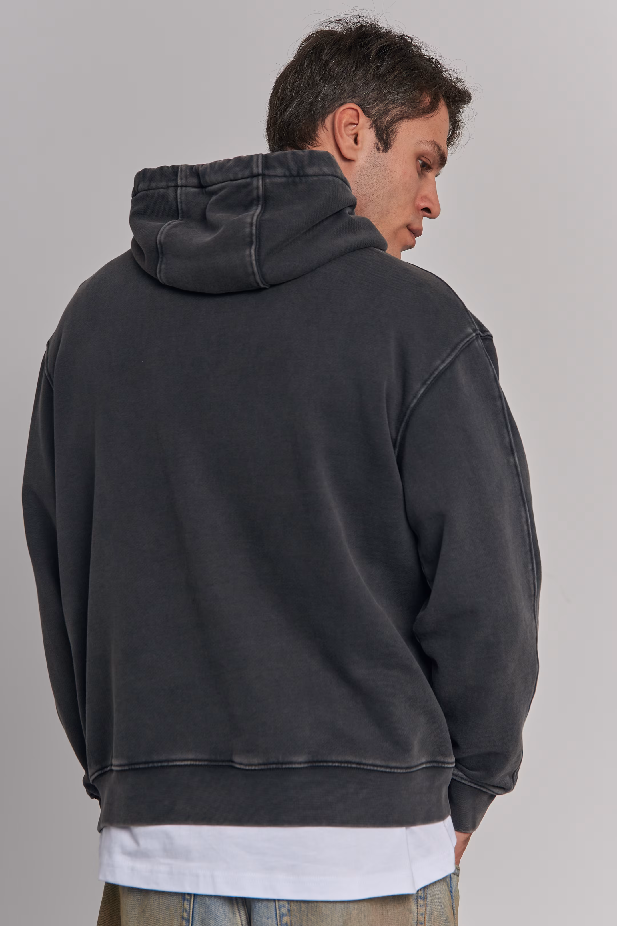 Oversized hoodie in jet black grey with a faded stone-wash finish. Hood with drawstrings, kangaroo pocket. Ribbed cuffs and hem. 100% cotton. Model measurements: Height 185 cm Chest 100 cm Waist 84 cm Hips 97 cm