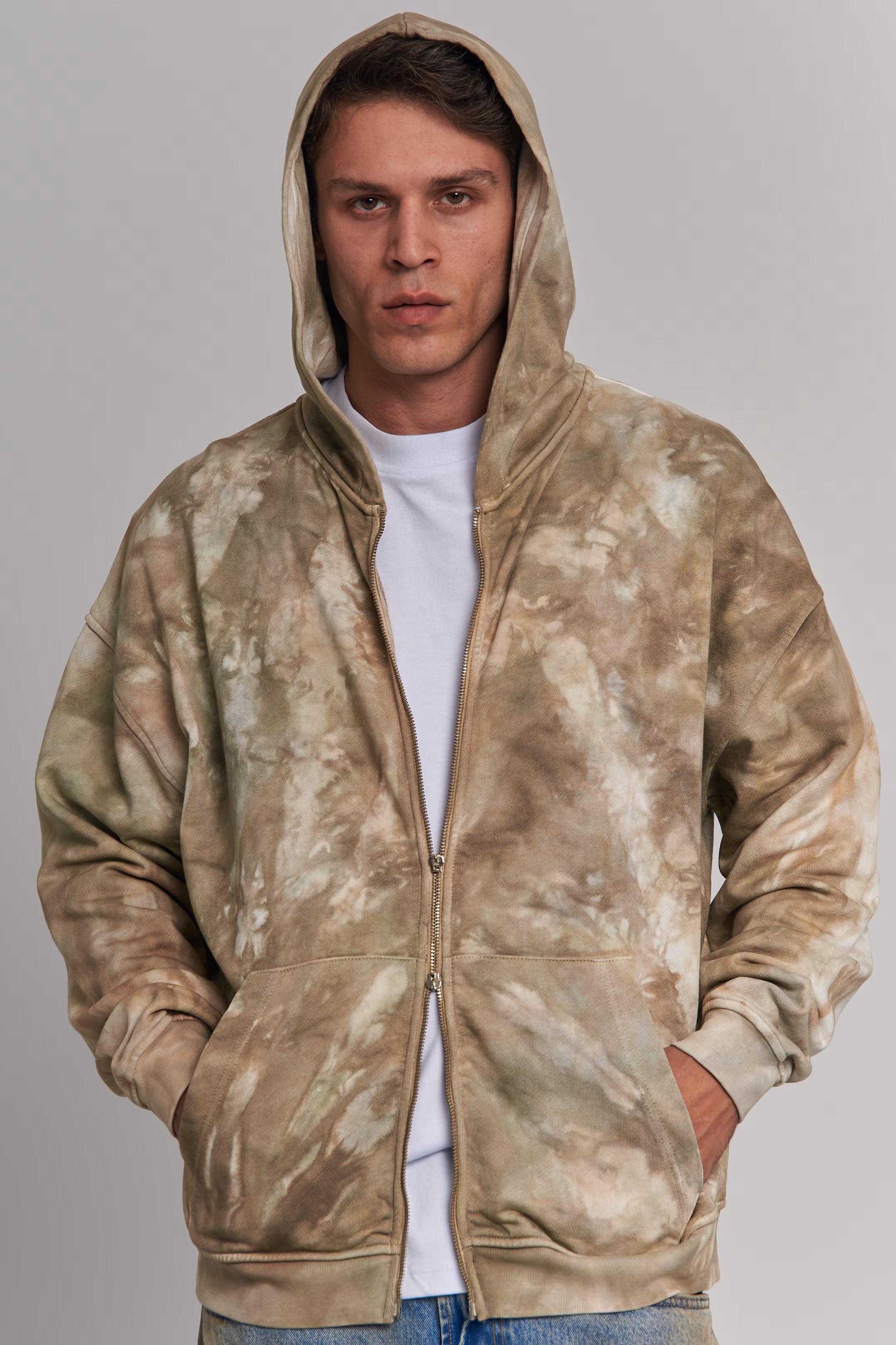 Oversized zip-up hoodie in a warm mocha, beige, and white tie-dye pattern. Full-length front zipper, hood, ribbed cuffs and hem. Model measurements: height 185 cm, chest 100 cm, waist 84 cm, hips 97 cm.