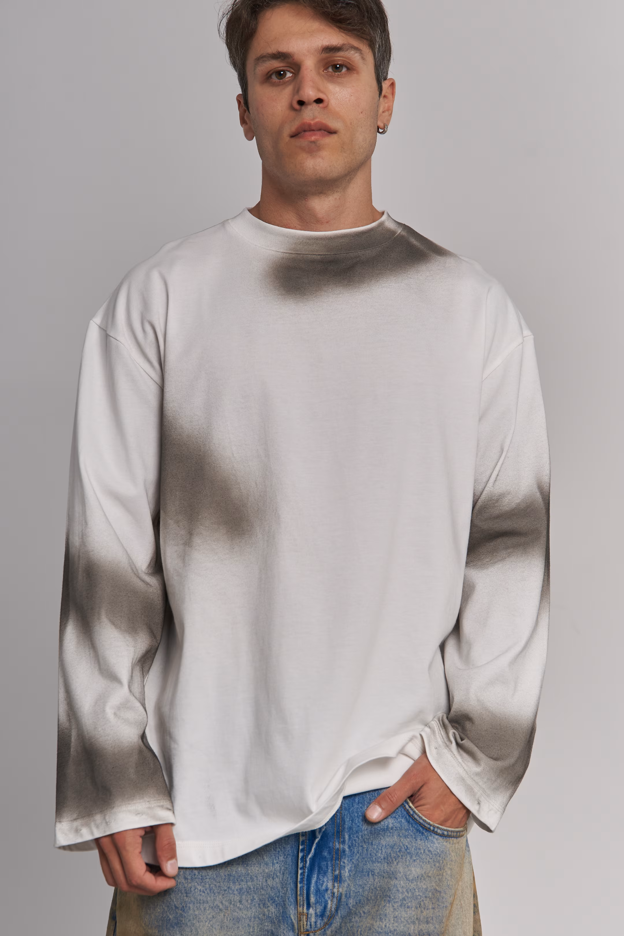 Oversized long-sleeve T-shirt in white with a dark grey ombre gradient at the shoulders and sleeve ends, fading to white at the centre body. Round neck, dropped shoulders, straight hem.