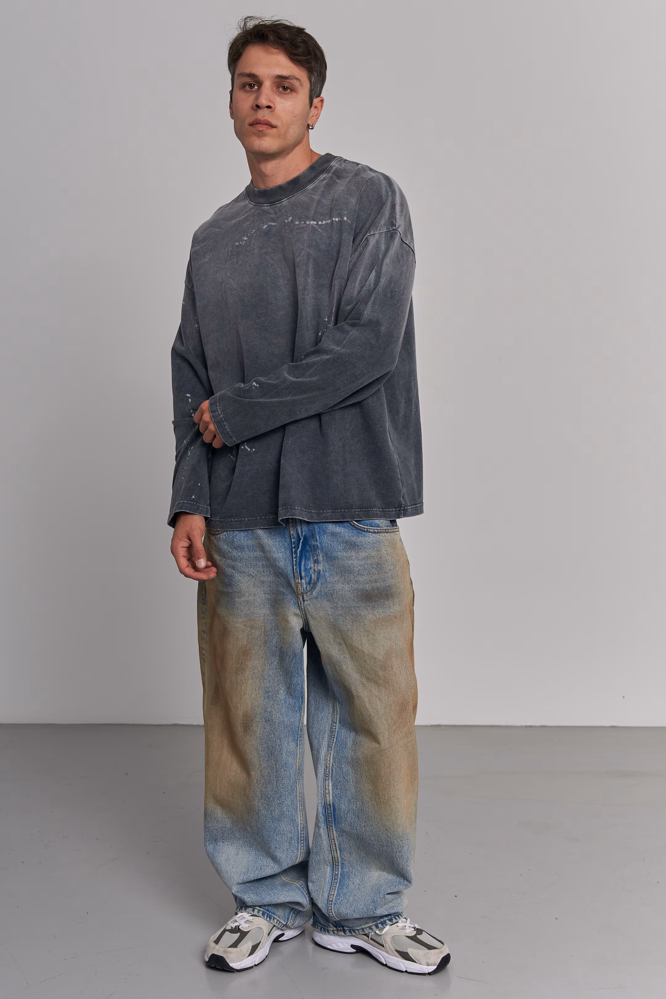 Oversized long-sleeve T-shirt in washed dark jet black with white paint splatter marks scattered across the body and a small text print on the chest. Round neck, dropped shoulders, straight hem.