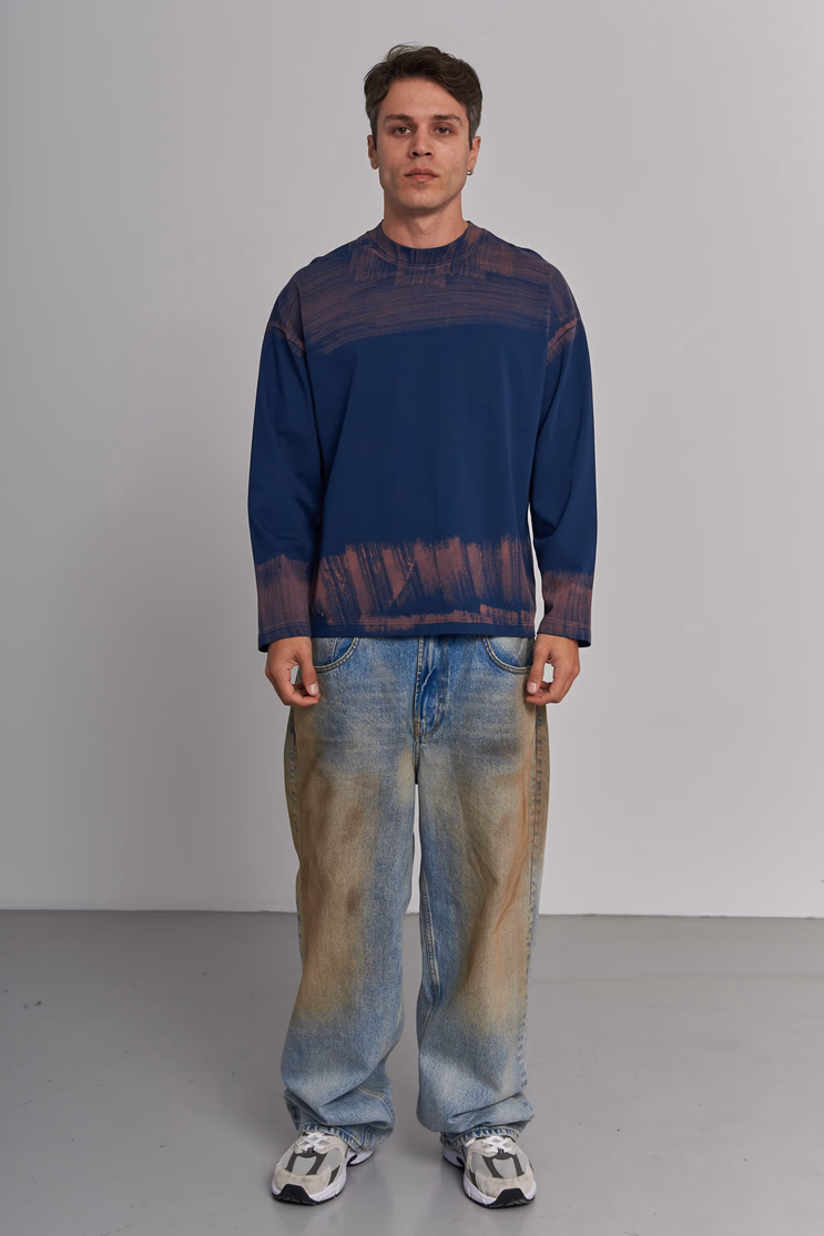Oversized long-sleeve T-shirt in navy blue with two horizontal bands of rust/terracotta brushstroke dye — one across the chest and one at the hem. Round neck, dropped shoulders, straight hem.