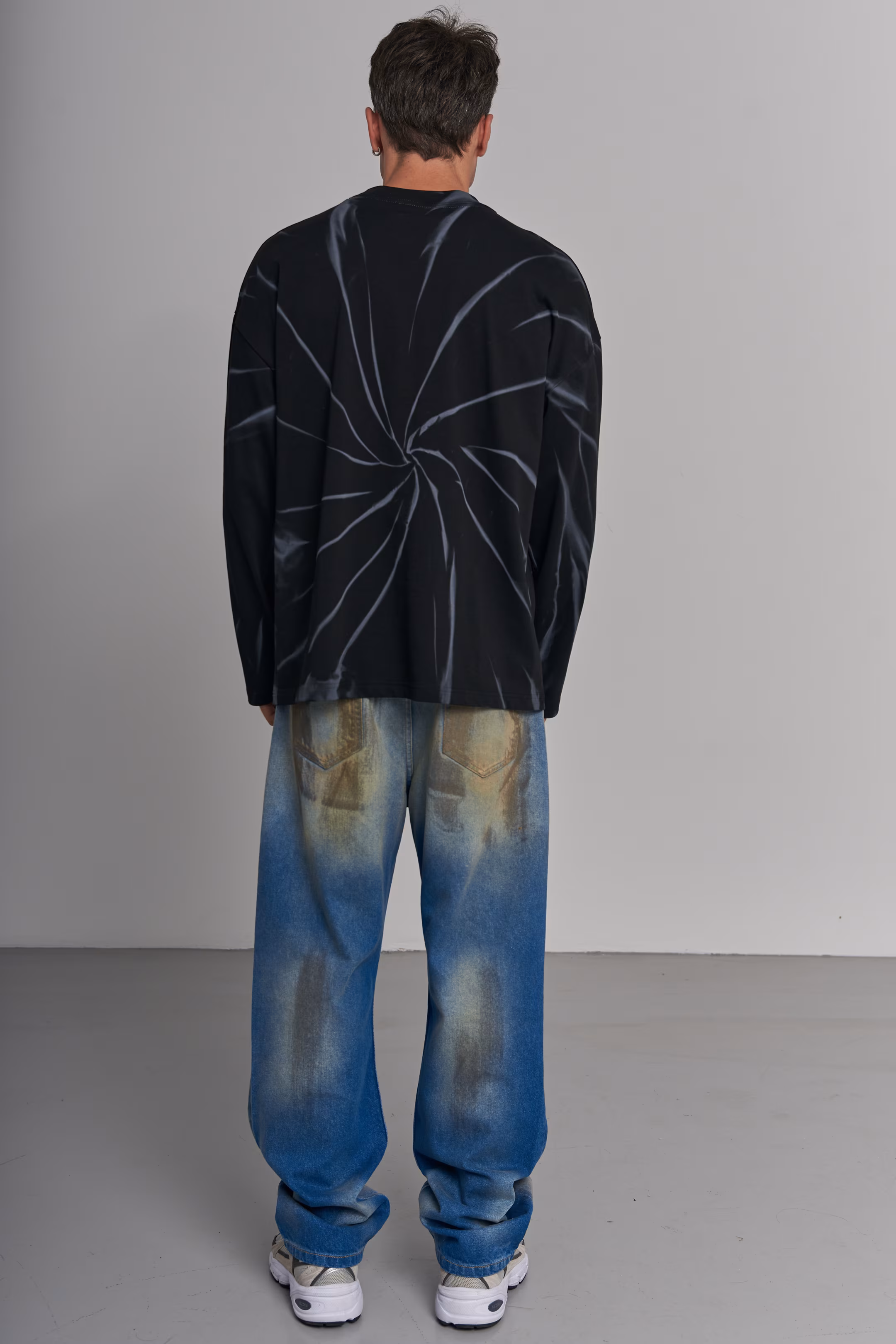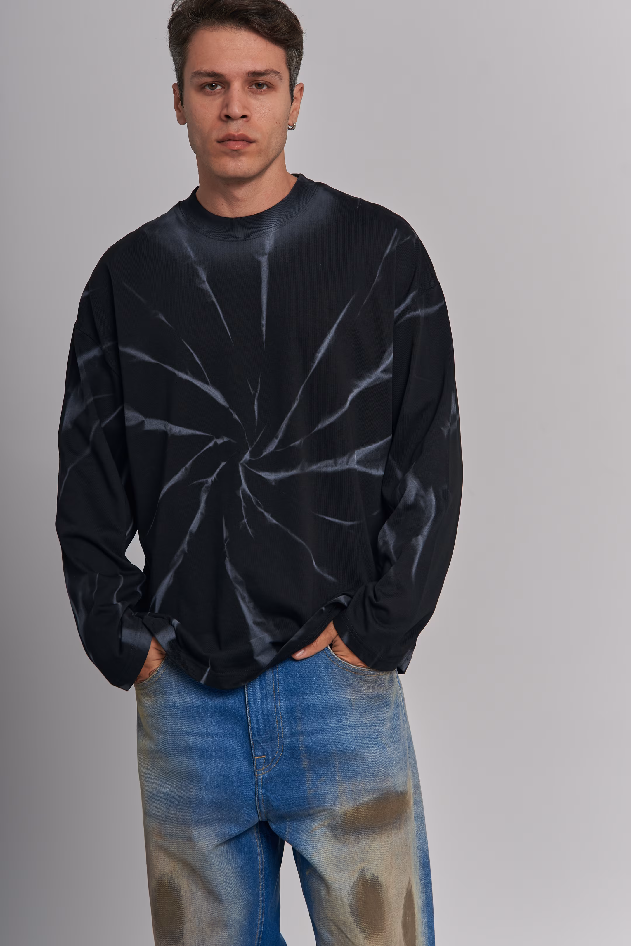 Oversized long-sleeve T-shirt in matte black with a spiral swirl tie-dye pattern — dark lines radiating from a central point across the entire garment. Round neck, dropped shoulders, straight hem.