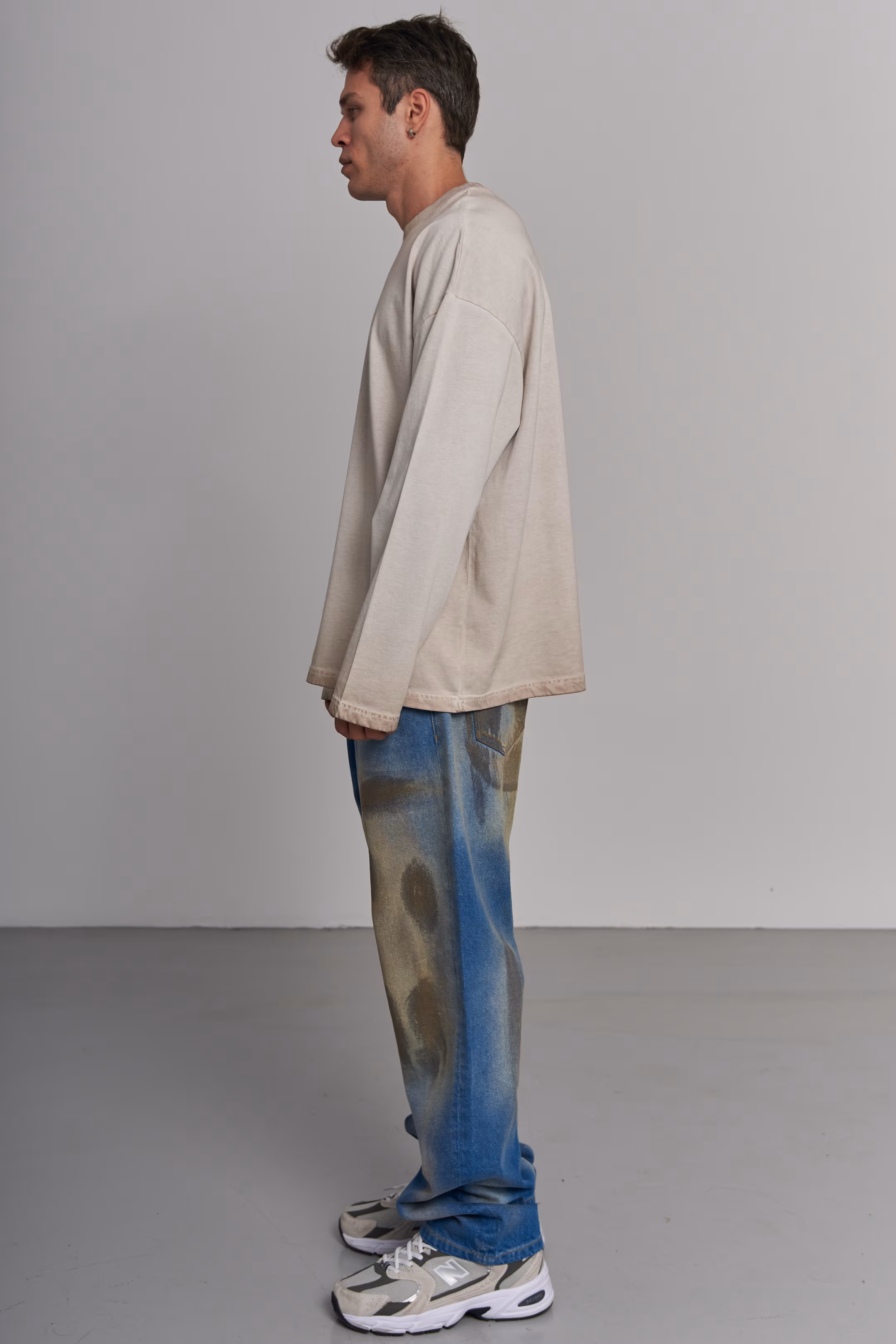 Oversized long-sleeve T-shirt in dark gray/cream with a washed, slightly faded finish. Visible ribbed hem band at the bottom. Round neck, dropped shoulders. Model measurements: height 185 cm, chest 100 cm, waist 84 cm, hips 97 cm.