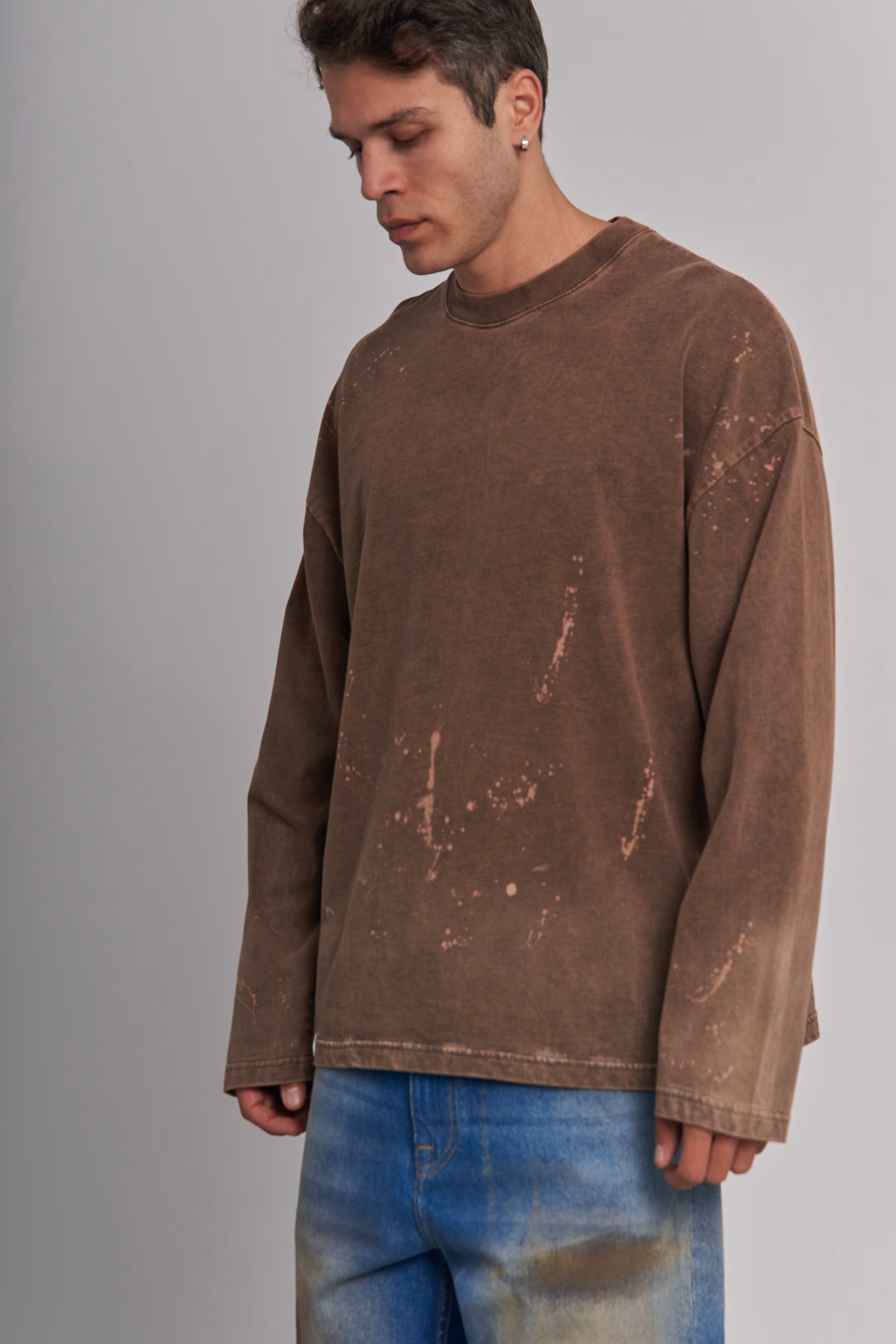 Oversized long-sleeve T-shirt in medium taupe with scattered pink/beige bleach splatter marks across the chest and sleeves. Round neck, dropped shoulders, straight hem.