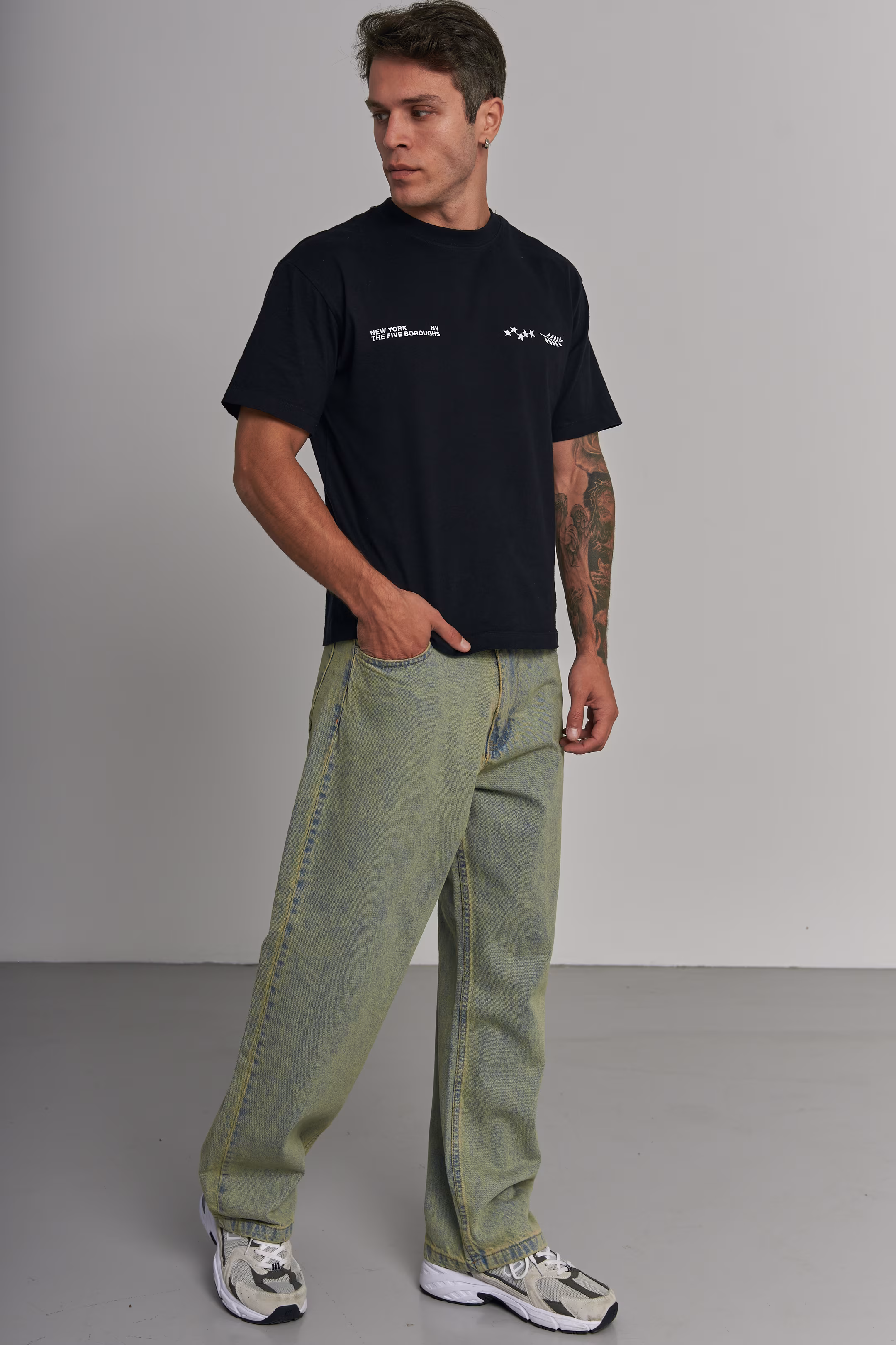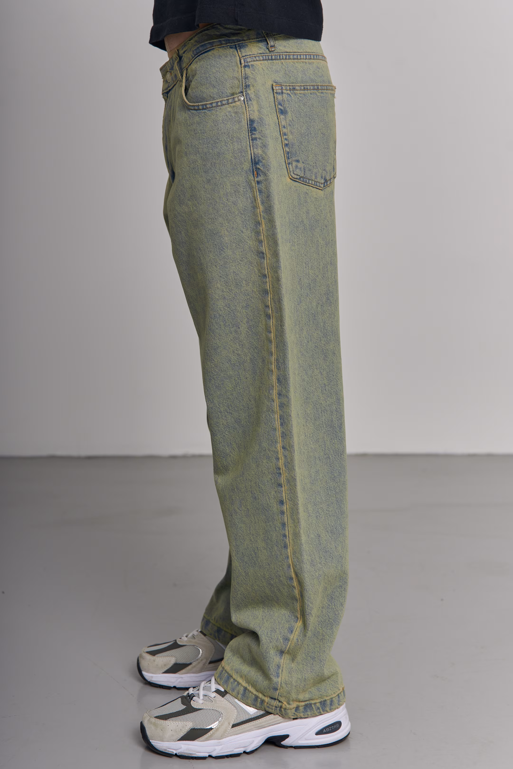 Wide-leg jeans in denim with an all-over yellow-green/steel gray overdye treatment. Five-pocket construction, zip fly. Model measurements: height 185 cm, chest 100 cm, waist 84 cm, hips 97 cm.