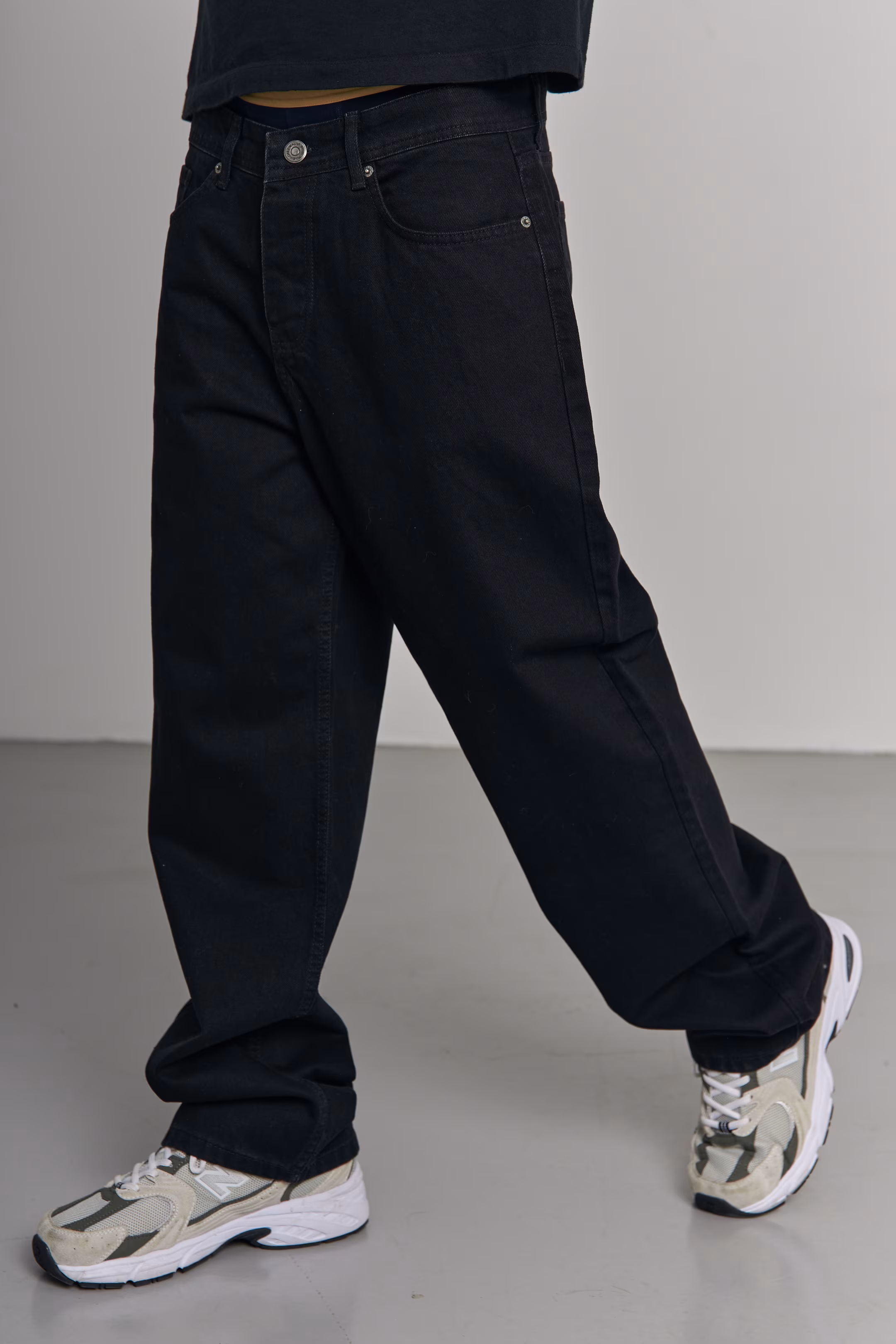 Wide-leg jeans in solid licorice denim with no wash effects. Five-pocket construction, zip fly. Model measurements: height 185 cm, chest 100 cm, waist 84 cm, hips 97 cm.