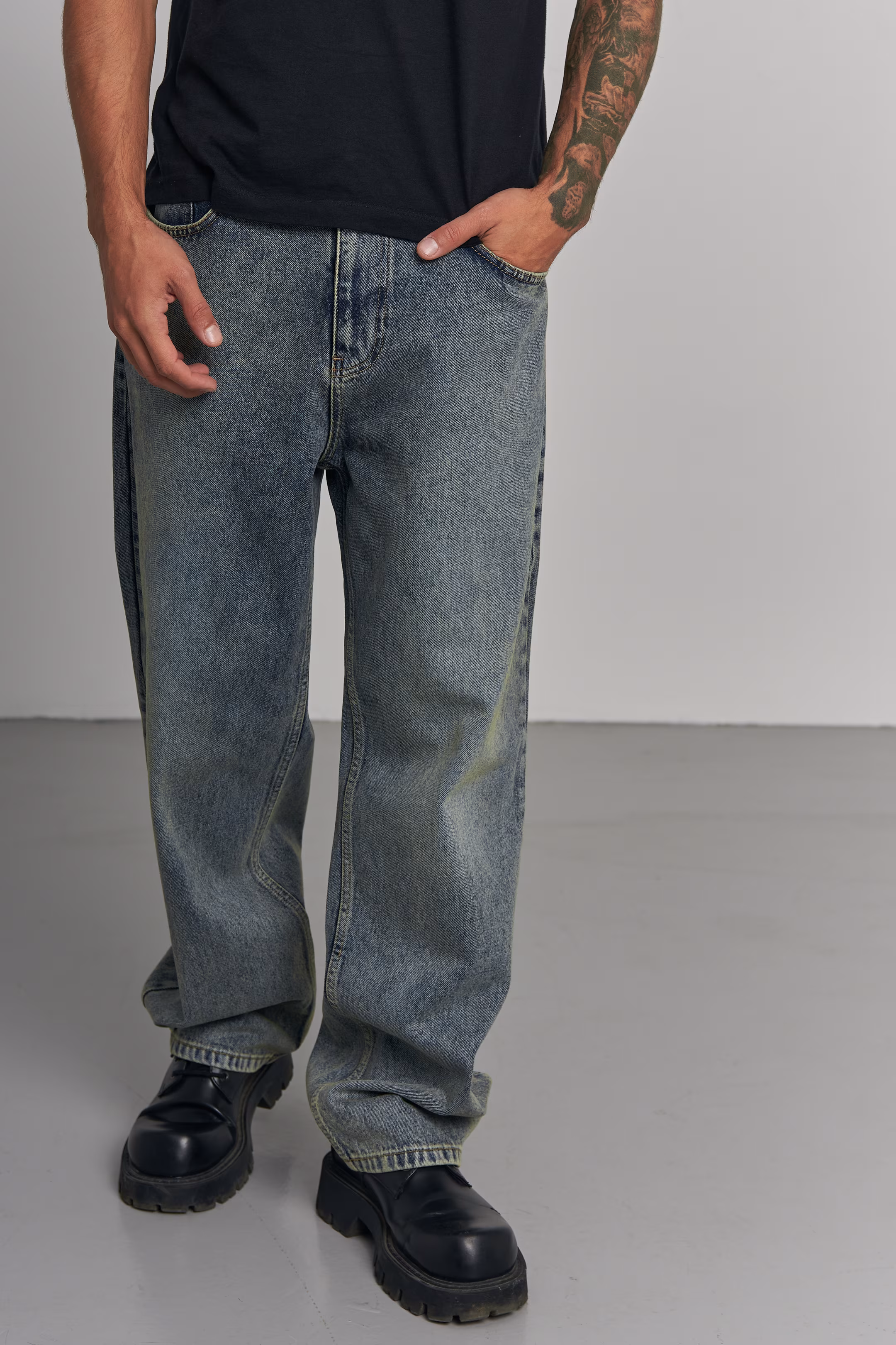 Wide-leg jeans in charcoal denim with a subtle teal undertone. Five-pocket construction. Clean wash finish with wide leg opening. Model measurements: height 185 cm, chest 100 cm, waist 84 cm, hips 97 cm.