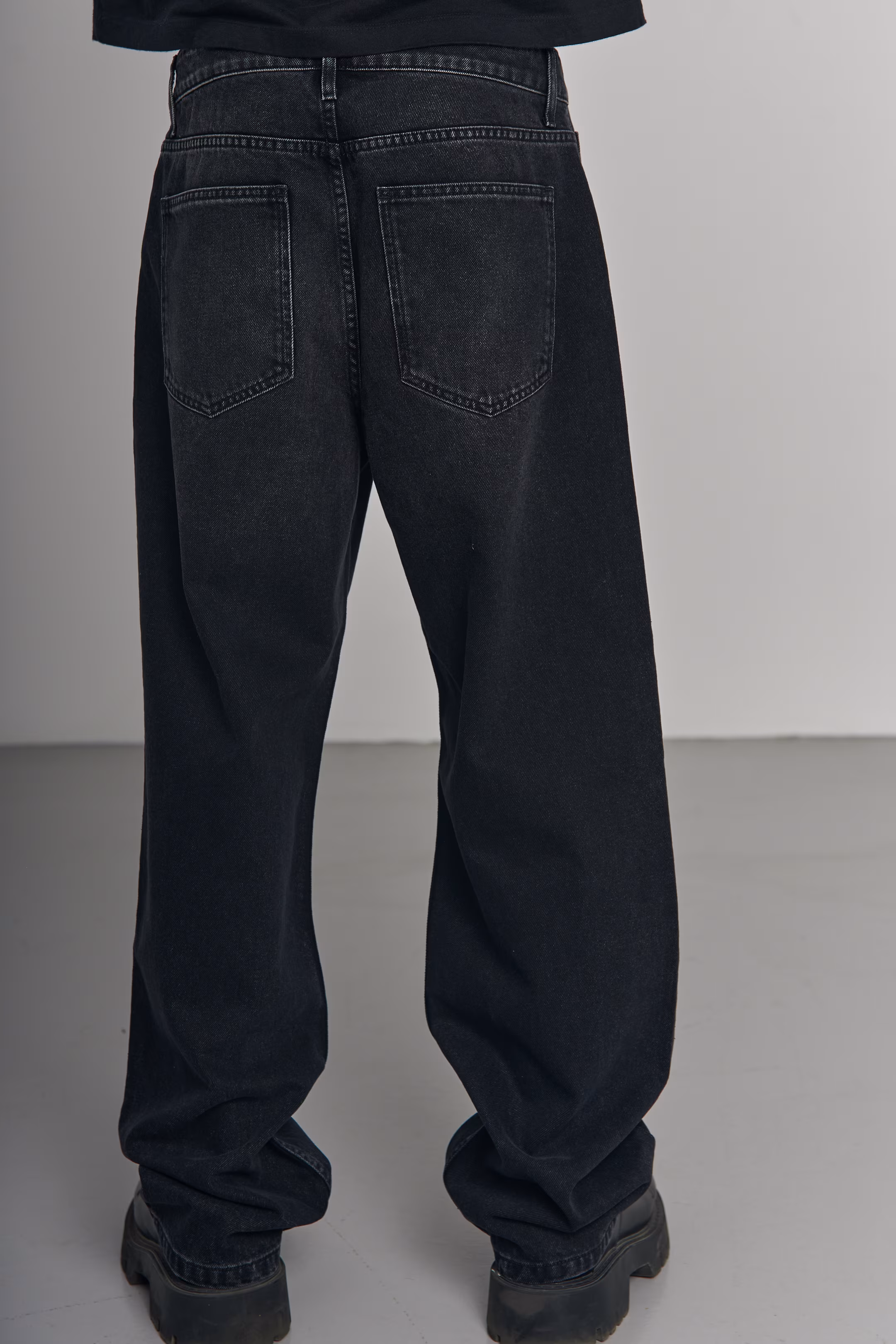 Wide-leg jeans in black denim with a washed grey tone throughout. Five-pocket construction. Relaxed fit through hip and thigh with wide leg opening. Model measurements: height 185 cm, chest 100 cm, waist 84 cm, hips 97 cm.