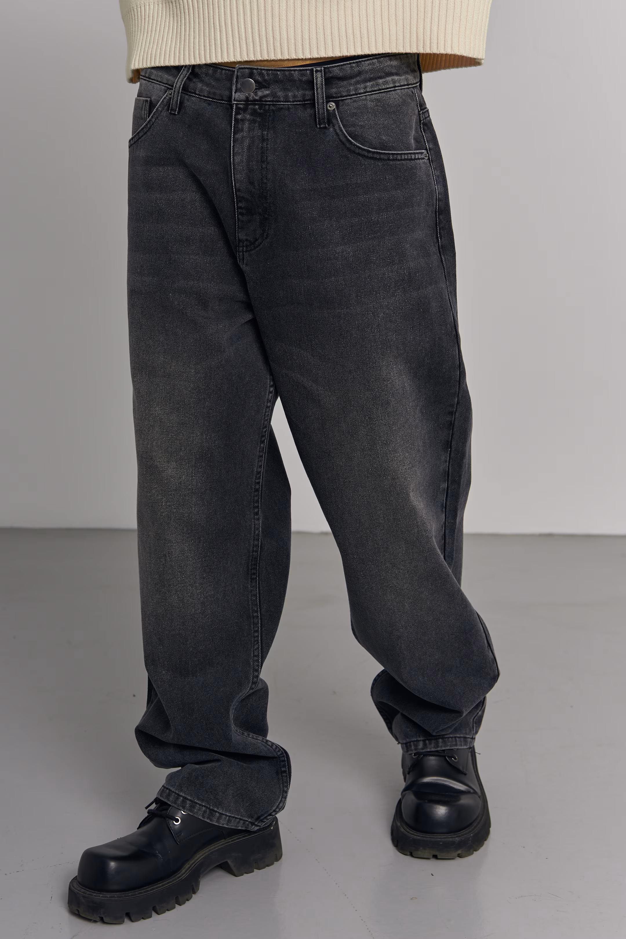 High-waisted wide-leg jeans in grey onyx. Features a faded stone-wash finish. Classic five-pocket construction and belt loops. 100% cotton denim. Model measurements: Height 185 cm Chest 100 cm Waist 84 cm Hips 97 cm