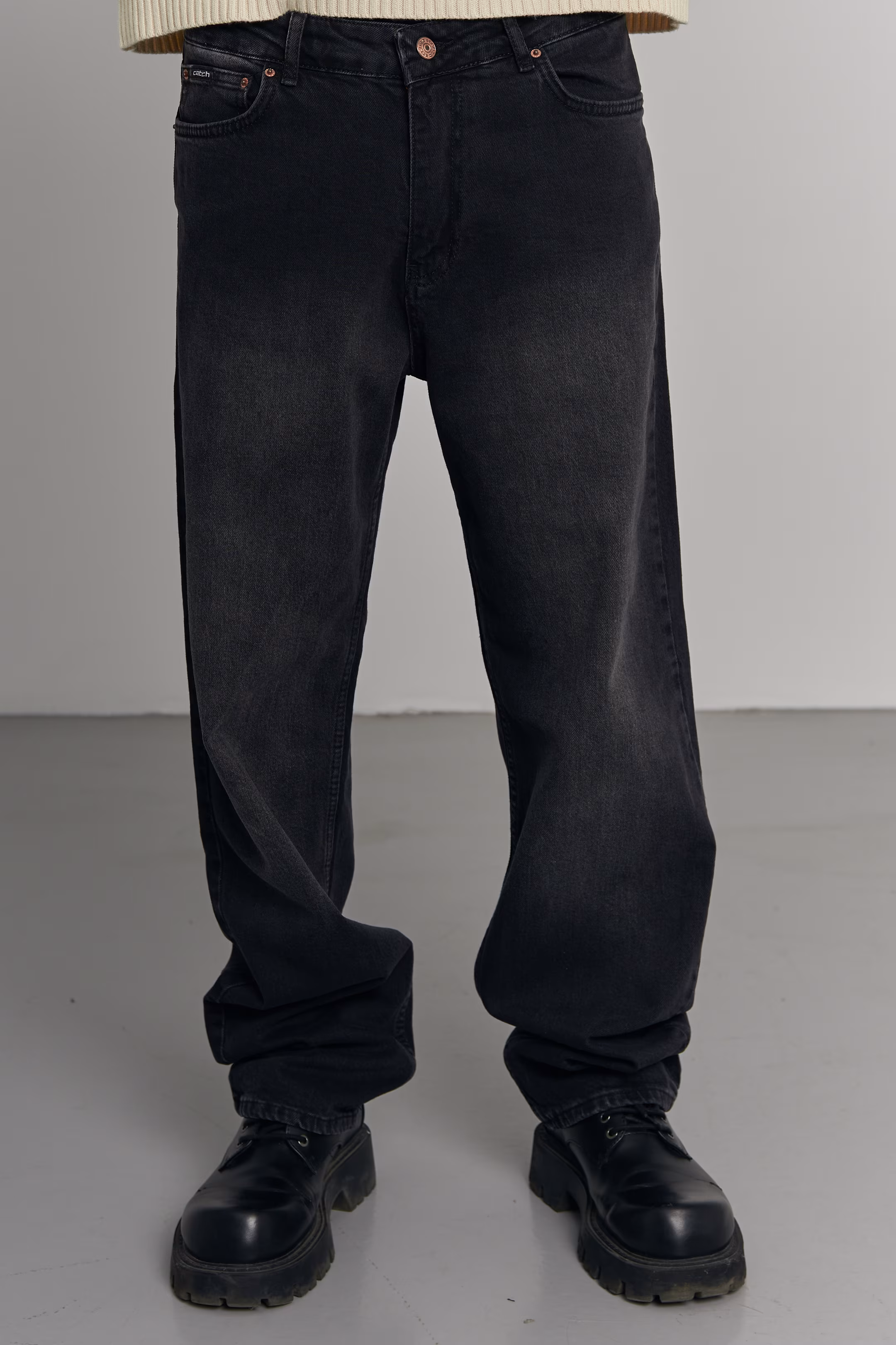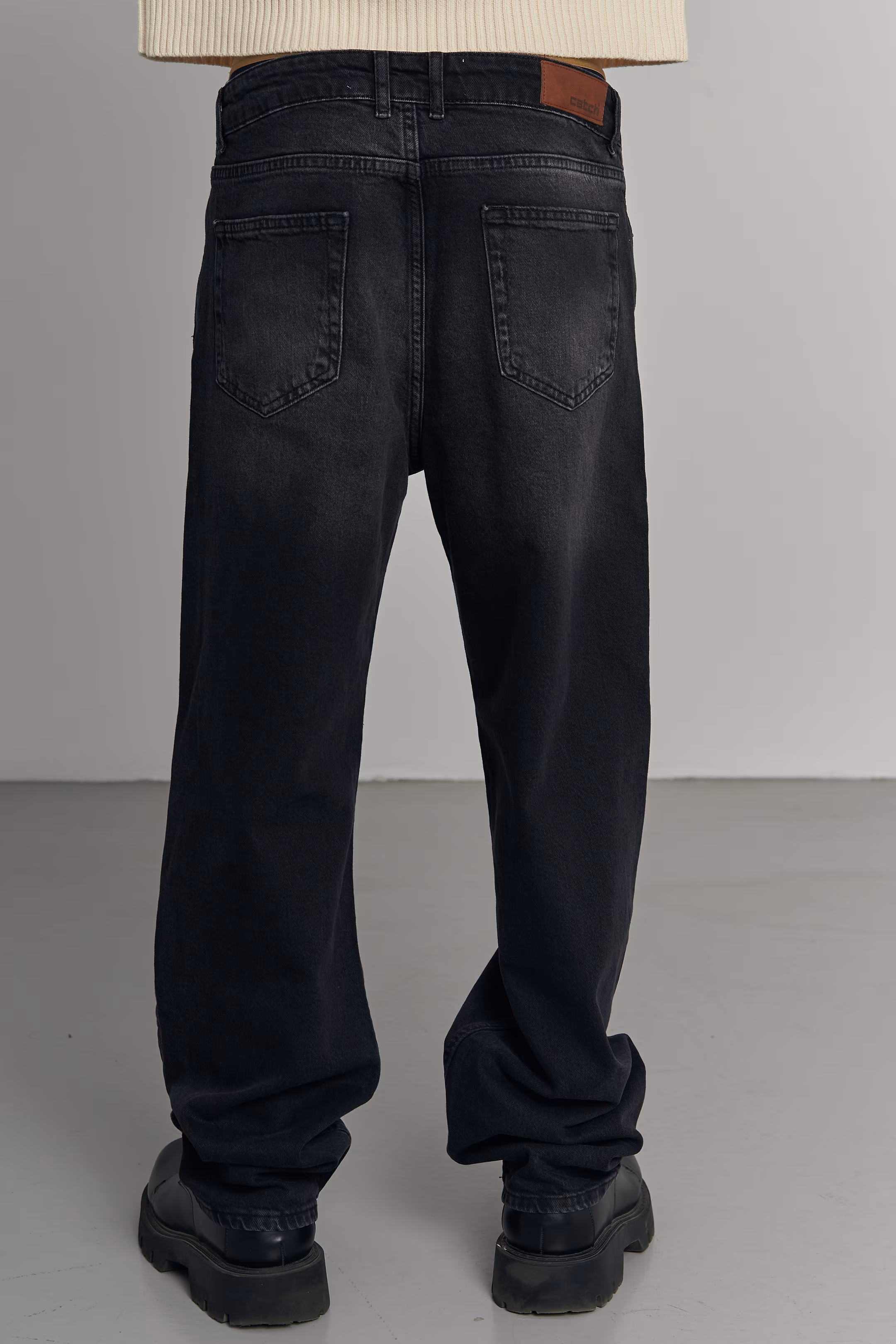 High-waisted men’s jeans in dark grey matte black with a stone-wash finish. Relaxed wide-leg fit. Classic five-pocket design, belt loops, and button closure. 100% cotton denim.