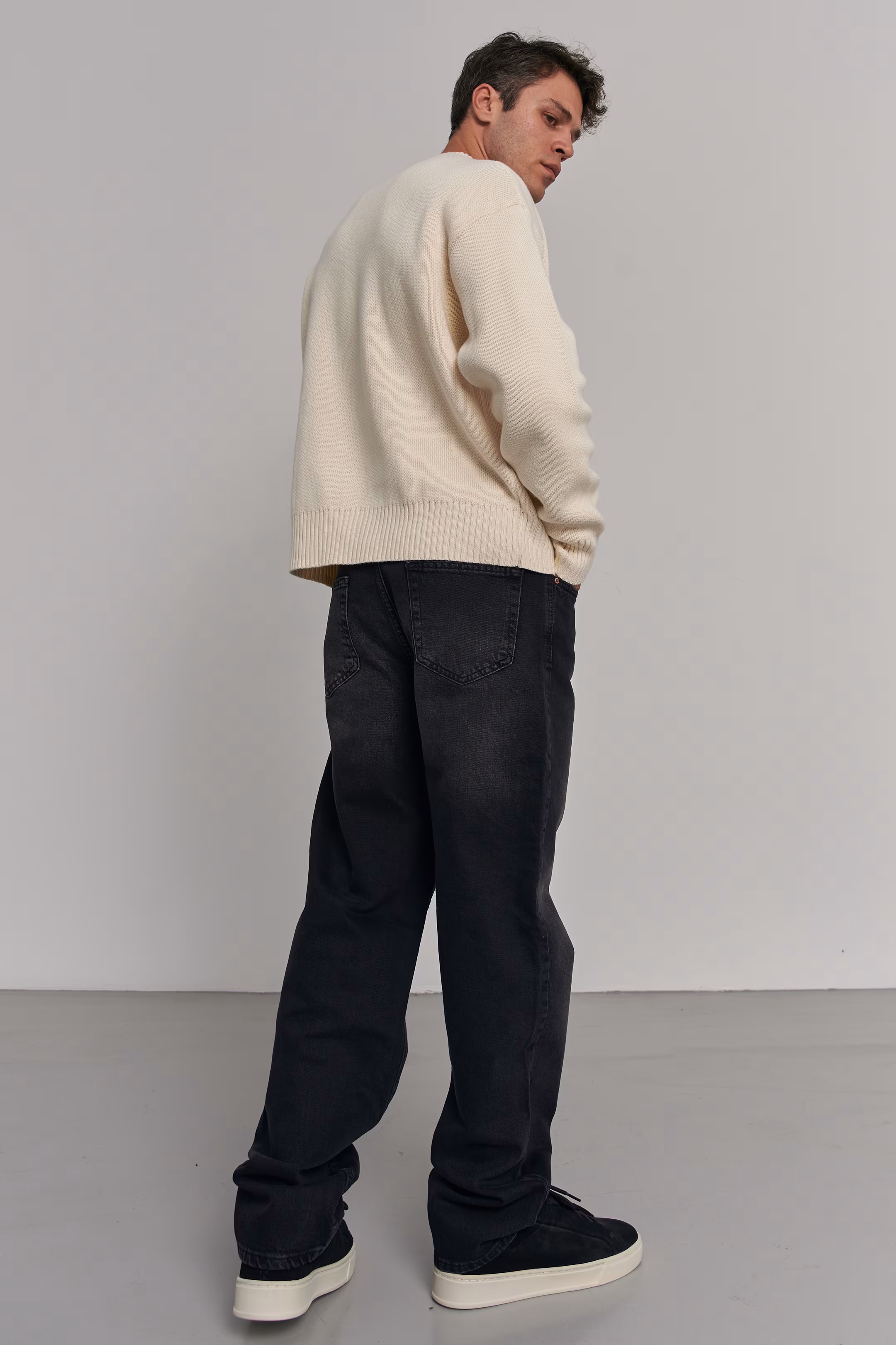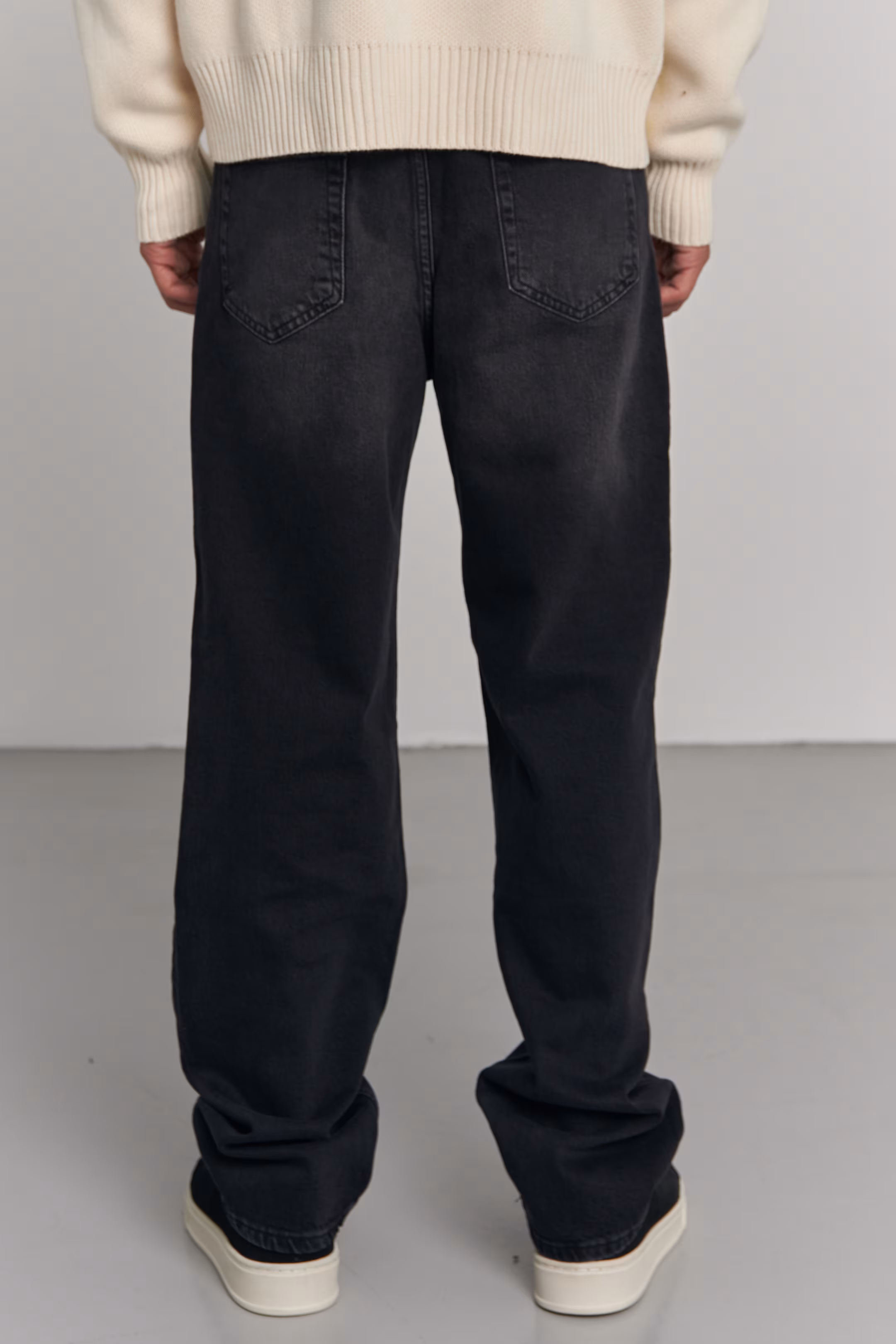 High-waisted relaxed fit jeans in matte black. Features a stone-wash finish with fading on the thighs and hems. Classic five-pocket design. 100% cotton denim. Model measurements: Height 185 cm Chest 100 cm Waist 84 cm Hips 97 cm