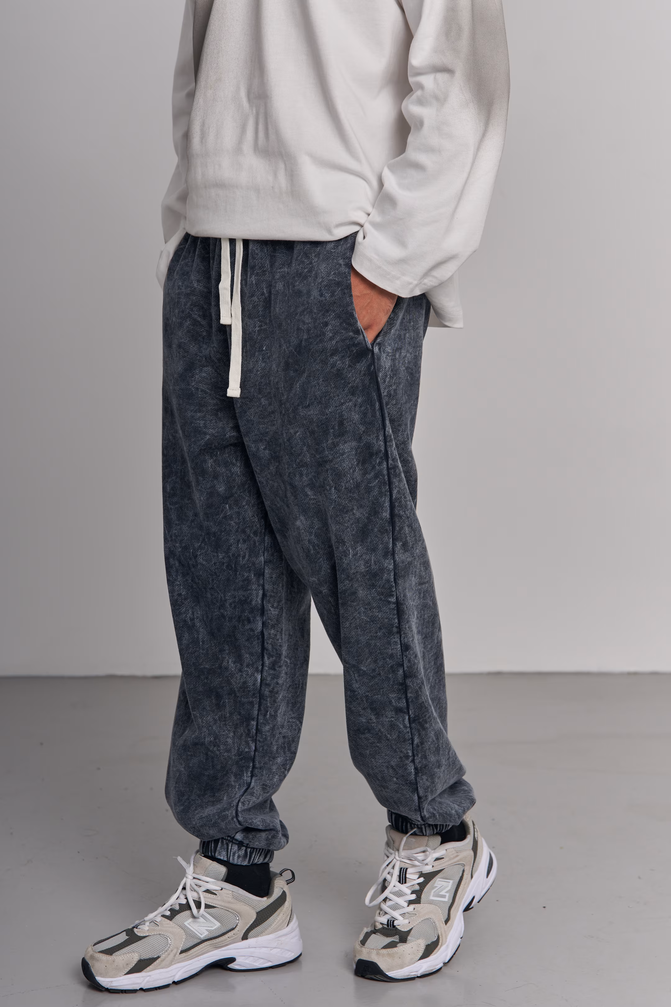 Sweatpants in jet black with an all-over stone-wash effect. Elastic waistband with drawstring, tapered leg, ribbed ankle cuffs. Model measurements: height 185 cm, chest 100 cm, waist 84 cm, hips 97 cm.